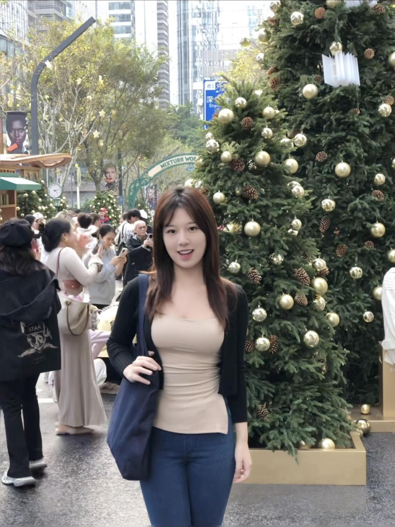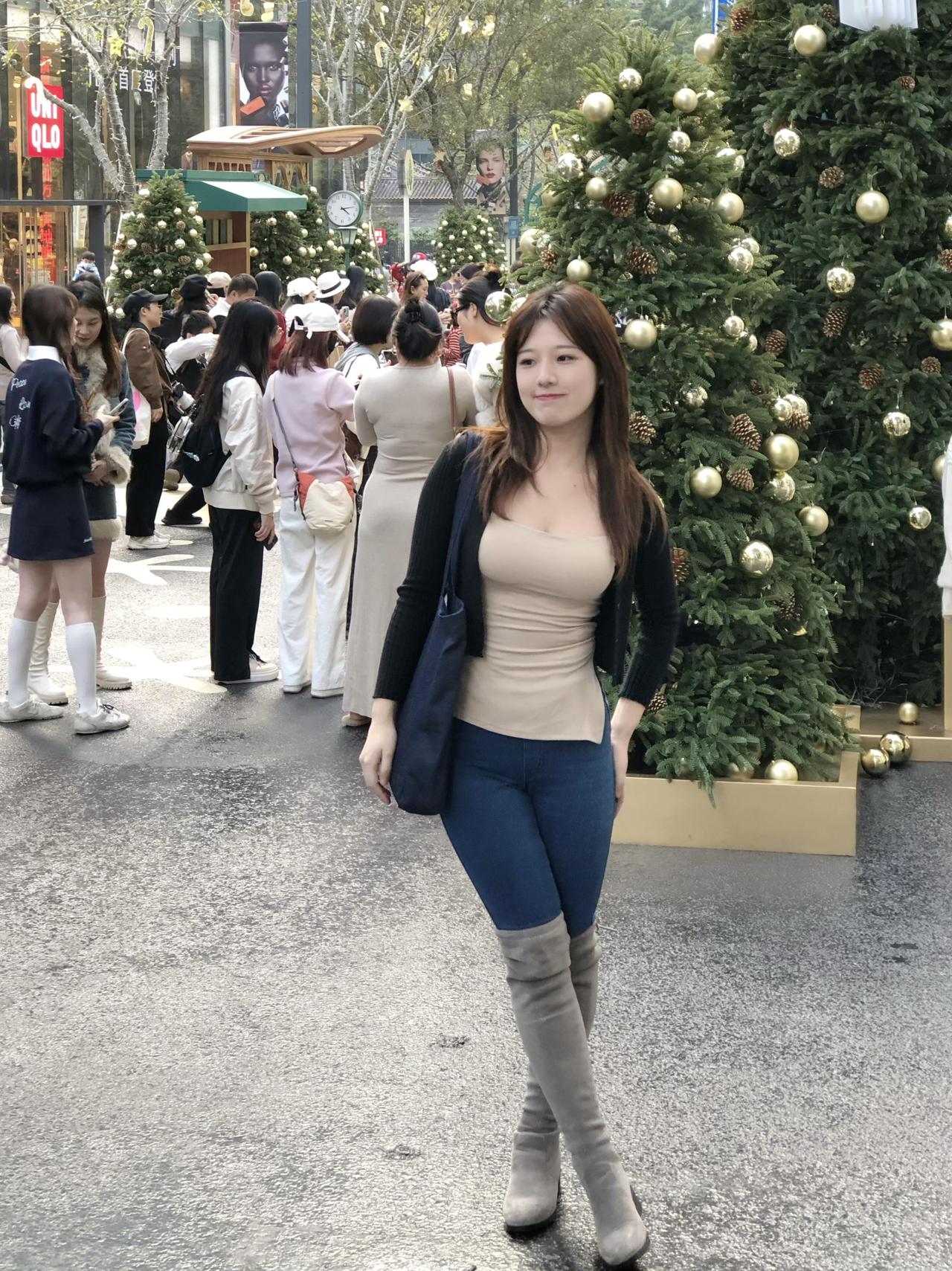 都市暖调 城市把喧嚣揉进柏油路的纹路 玻璃幕墙反射着细碎的光 她踩着午后的风走来 黑色针织开衫裹住温柔 卡其色内搭像一杯温吞的拿铁 肩侧的藏青布袋晃悠 装着没说出口的轻快 牛仔裤勾勒出步履的弧度 过膝长靴碾过街边的落叶 发丝垂落时 拂过圣诞树枝头的金饰 驻足在人群与圣诞树之间 笑意漫过眉梢 周遭的喧闹都成了背景 只有金色球饰的反光 落在她眼底 揉成一捧柔软的甜 转身走向林立的楼宇时 背影融进都市的暖调里 步履不疾不徐 像晚风拂过橱窗 把匆忙的时光 都熨帖成松弛的模样 坐在青绿的椅子上 圣诞树的香气漫过来 木质书架旁的光影 把这一刻的温柔 定格成城市里 不慌不忙的风景