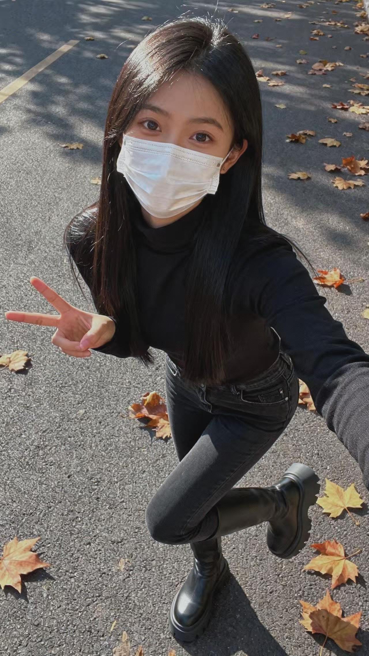 秋日穿搭指南🍂 黑衣少女,口罩相伴,阳光明媚,落叶飘零。女生怎么穿搭会看上去很