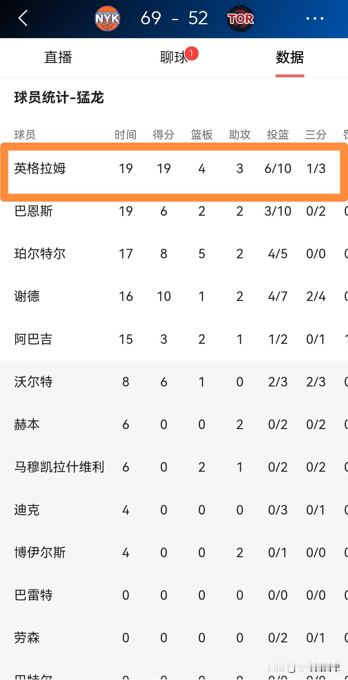 猛龙球星英格拉姆的得分能力真是顶级水准!在今天猛龙主场迎战尼克斯的比赛中,目前双方半场战罢,猛龙以52:69落后于对手。虽然猛龙目前处于落后,但是英格拉姆在上半场比赛中首发出战19分钟,投篮10中6,其中三分球3中1、罚球8中6得到19分4篮板3助攻2抢断。 在上半场比赛中,英格拉姆和尼克斯头号球星布伦森展开了一场针尖对麦芒的对攻,让人看的非常过瘾。