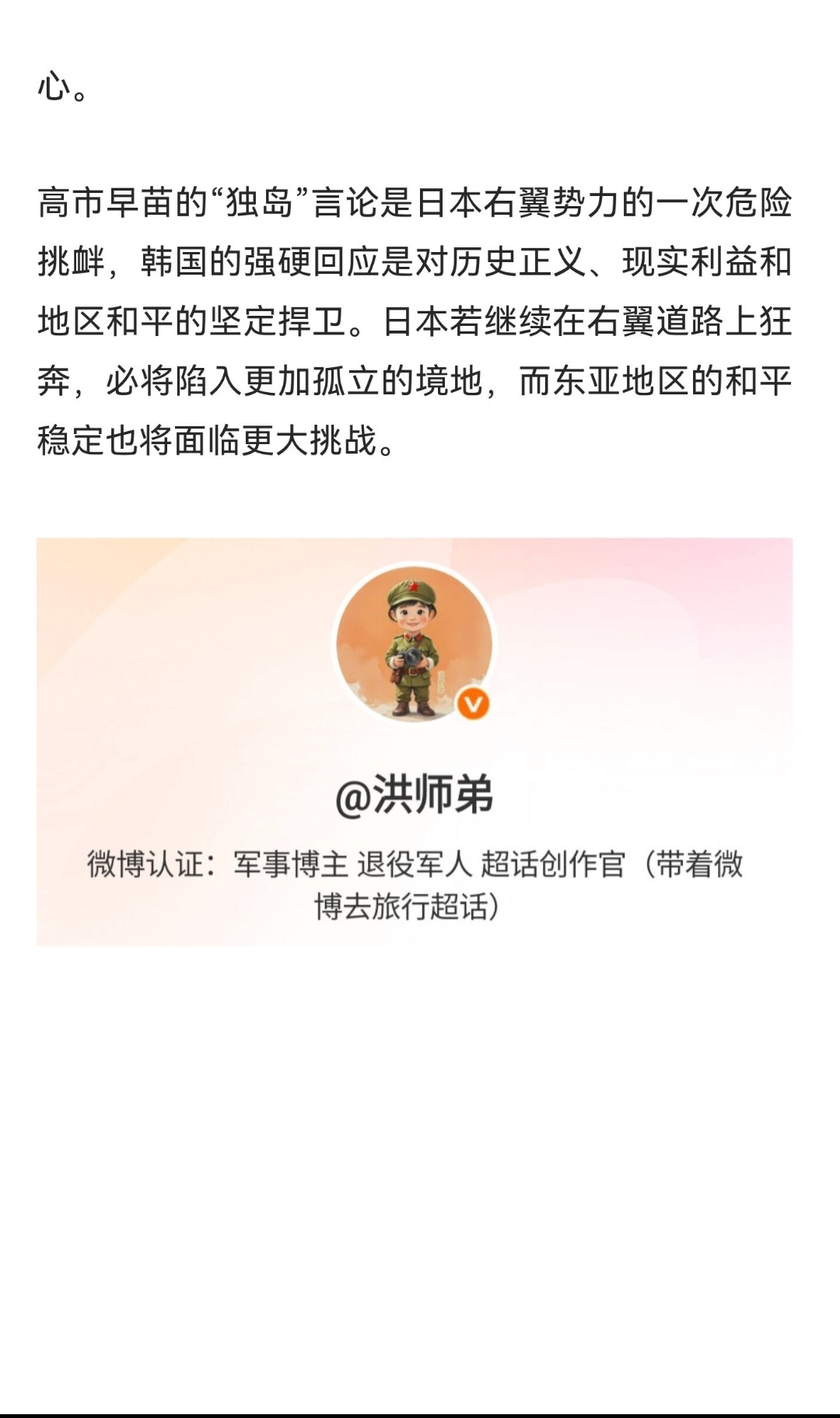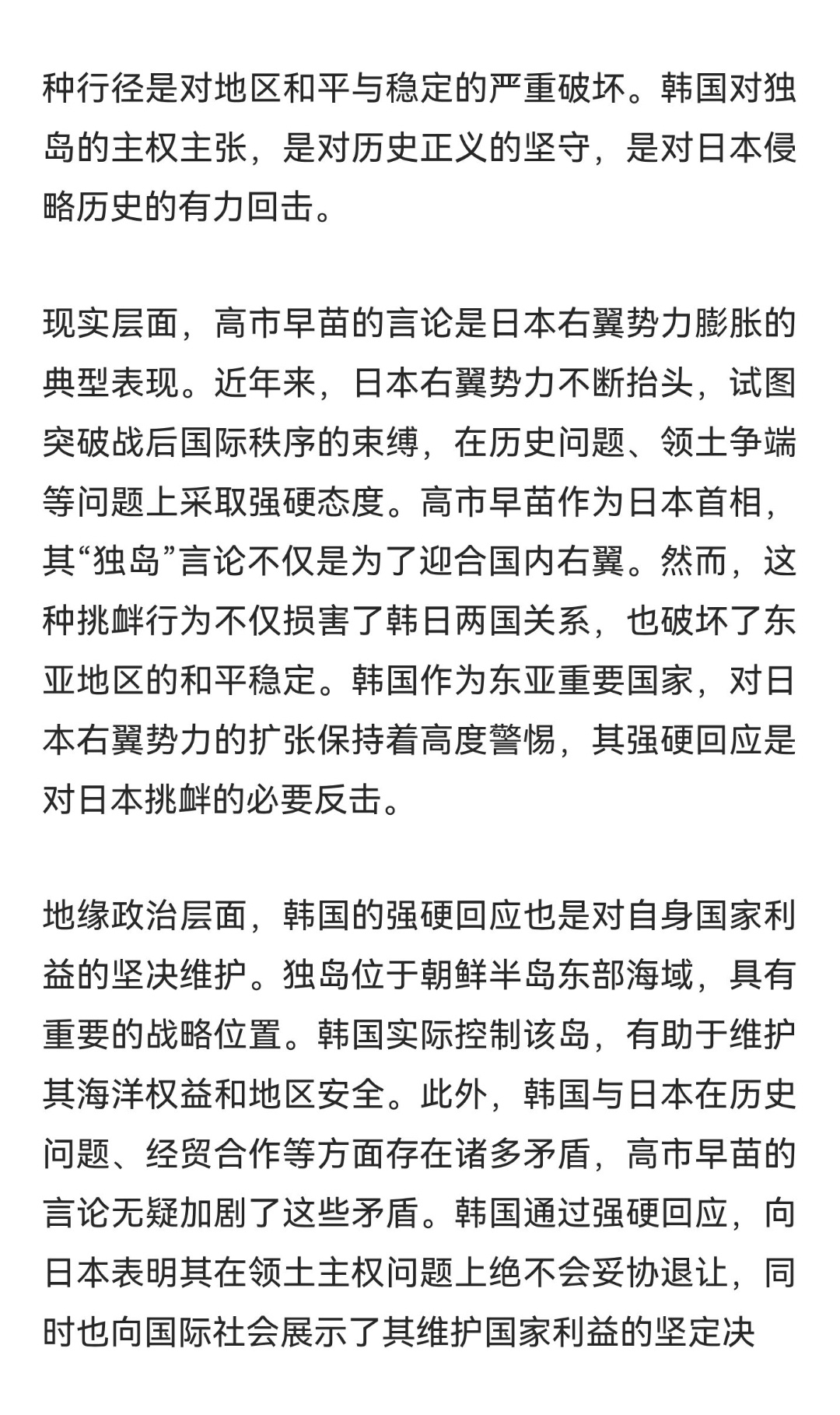 | 日本首相高市早苗近期在国会宣称“竹岛(韩国称独岛)是日本固有领土”,这一言论在东亚地区激起千层浪,韩国方面迅速地予以回应。韩国自1954年起就派兵驻守该岛,长期实际控制。而日本对独岛的主权主张,是对历史事实的公然歪曲。日本在1910年至1945年对朝鲜半岛进行长达35年的殖民统治,期间犯下无数罪行,如今却妄图通过篡改历史、强占领土来掩盖侵略历史,这种行径是对地区和平与稳定的严重破坏。韩国对独岛的主权主张,是对历史正义的坚守,是对日本侵略历史的有力回击。近年来,日本右翼势力不断抬头,试图突破战后国际秩序的束缚,在历史问题、领土争端等问题上采取强硬态度。高市早苗作为日本首相,其“独岛”言论不仅是为了迎合国内右翼。然而,这种挑衅行为不仅损害了韩日两国关系,也破坏了东亚地区的和平稳定。韩国作为东亚重要国家,对日本右翼势力的扩张保持着高度警惕,其强硬回应是对日本挑衅的必要反击。独岛位于朝鲜半岛东部海域,具有重要的战略位置。韩国实际控制该岛,有助于维护其海洋权益和地区安全。此外,韩国与日本在历史问题、经贸合作等方面存在诸多矛盾,高市早苗的言论无疑加剧了这些矛盾。韩国通过强硬回应,向日本表明其在领土主权问题上绝不会妥协退让,同时也向国际社会展示了其维护国家利益的坚定决心。高市早苗的“独岛”言论是日本右翼势力的一次危险挑衅,韩国的强硬回应是对历史正义、现实利益和地区和平的坚定捍卫。日本若继续在右翼道路上狂奔,必将陷入更加孤立的境地,而东亚地区的和平稳定也将面临更大挑战。