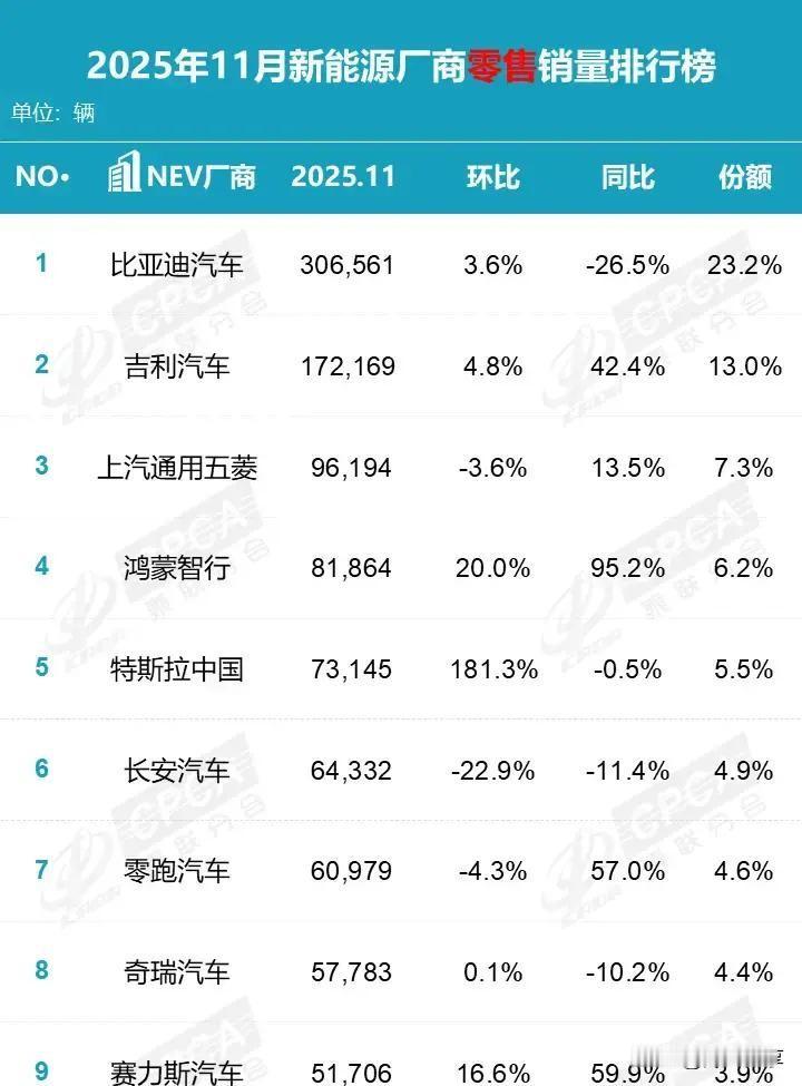 11月份国内车市整体有点儿喘不过气,总销量跌到222.5万辆,比去年同期少了8成多,环比也小降1成出头。可别慌,新能源这块儿还算硬气,零售132万辆,同比涨了4成多,累计一年卖出1147万辆,增速稳稳19%。这说明燃油车正被挤兑得节节败退,渗透率冲到59%,老百姓买车越来越偏向电驱和混动,省油又智能。 瞅瞅厂商排行,比亚迪还是那头独角兽,甩开第二名一大截,月销30.7万辆,份额占23%,虽说同比掉26%,但靠纯电加插混的双管齐下,稳坐头把交椅。吉利紧咬不放,17.2万辆进账,同比狂飙42%,份额13%,银河系列卖得火热,转型新能源的路子走对了。五菱和长安稳扎稳打,各超9万和6万台,份额7%和5%,家用车市场吃香。 惊喜来了,新势力杀出重围!鸿蒙智行暴增95%,8.2万辆直冲前五,智能生态拉满用户黏性。小米首年就干到4.6万辆,同比翻倍,性价比王者风范显露无疑。零跑和赛力斯也各6万多台,增速57%和60%,专注中低端纯电,抢滩成功。特斯拉呢?7.3万辆环比翻倍,但同比微降,Model系列更新换代后,份额5.5%,得加把劲儿跟上本土节奏。奇瑞5.8万辆小涨,稳在4%份额。 在我这波销量洗牌信号明显,中国品牌正从量变到质变,智能网联和混动是未来王道。谁能先啃下中高端市场,谁就笑到最后。车市寒冬里,新能源热浪正涌,普通人换车时机到了,早入手早享受绿色出行乐子