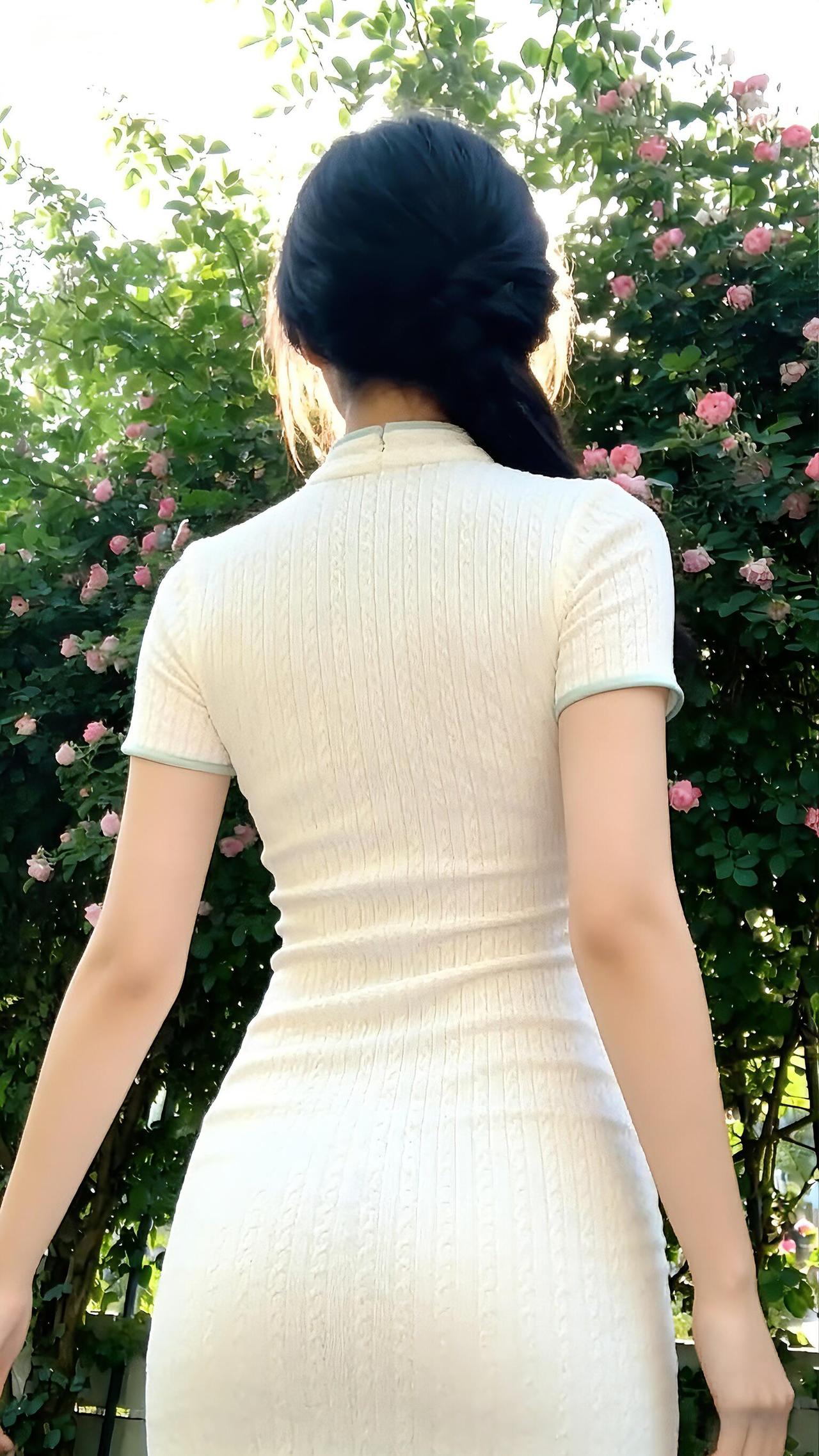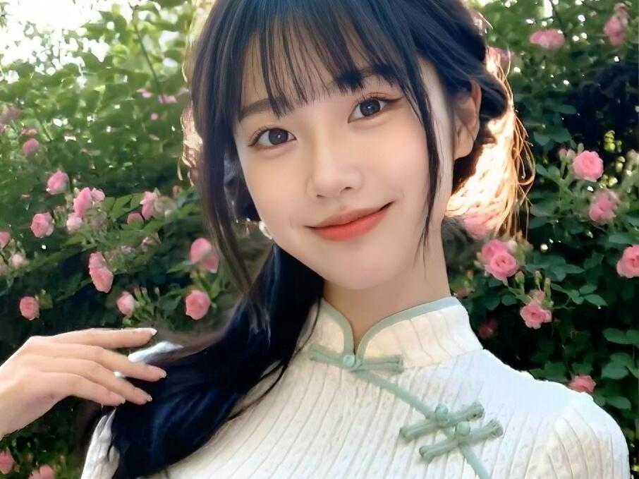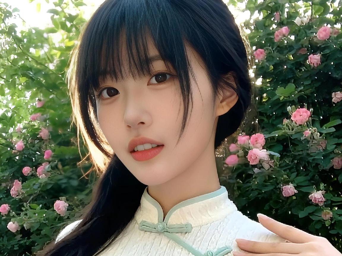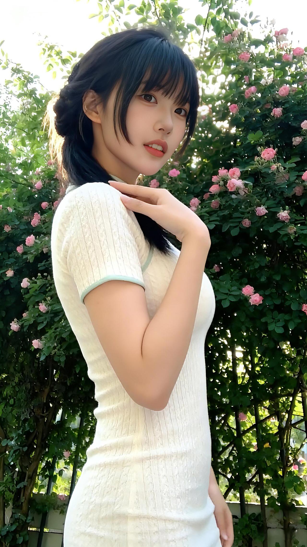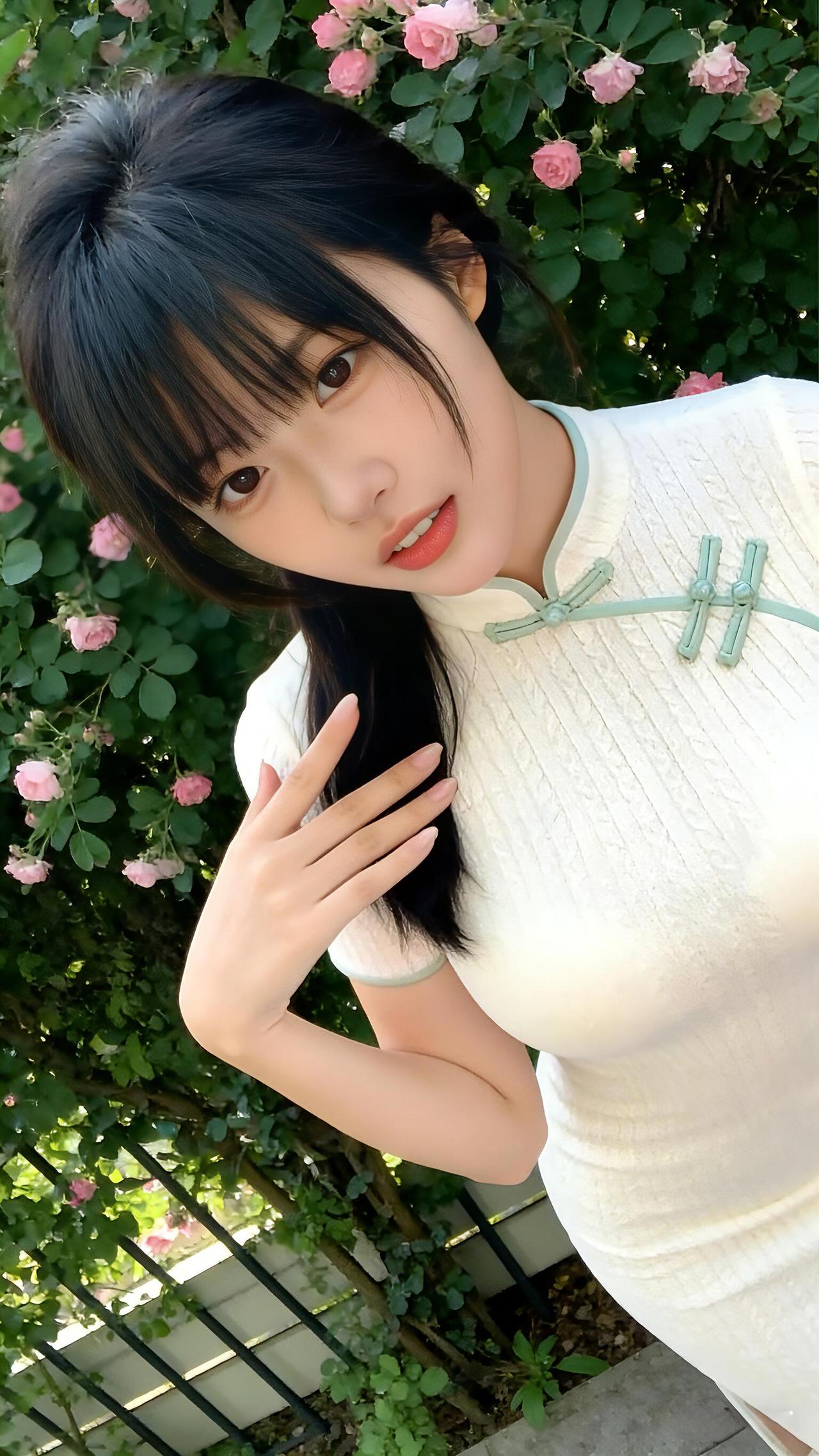 蔷薇与旗袍 晚风漫过藤蔓时 蔷薇把粉色的甜,揉进光的褶皱里 她立在绿意泼洒的角落 白旗袍裹着江南的软 青缎盘扣是别在襟上的云 顺着肌理,漫过肩线的弧度 发梢垂落的碎影 蹭着花枝轻晃 睫羽掀动时 漏下几缕金芒,落在微扬的唇角 像春酿刚启封的甜 不灼人,却漫了满身 转身的瞬间 黑发绾着晚风,脊背是未展的诗 旗袍的纹路贴着腰肢 把温柔的弧度,藏进蔷薇的影里 背影走向绿意深处时 裙摆扫过的风 都沾了草木的香 不必说江南,不必说温婉 光是站着 就把人间的软,揉成了具象的模样 蔷薇开得热烈,她站得安静 白与粉,青与绿 在时光里,酿成一帧不褪色的温柔 风掠过,盘扣轻响 是光阴低头时 悄悄说的,关于美的私语风吹过蔷薇 紫藤花旗袍