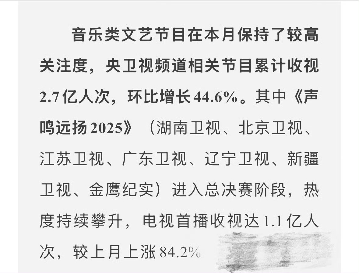 声鸣远扬收视达1.1亿远超同期在央卫视频道2.7亿的大盘里杀出血路,占比近41%!这成绩说一句音综天花板不为过吧!狠狠期待接下来的舞台,继续乘声远航!声鸣远扬