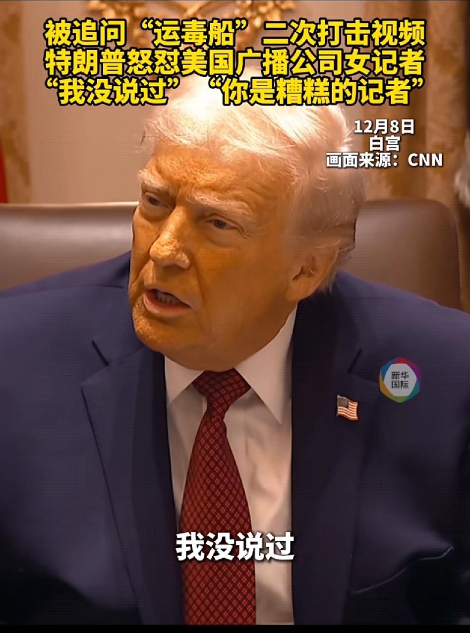 特朗普当场撒谎! 美国总统特朗普8日被追问何时公布打击委内瑞拉一艘“运毒船”的完整视频时,当即发飙,怒斥这是假新闻,表示自己根本没有说过这句话,并怒斥这名记者“是最讨厌的人”。 实际上,特朗普在12月3日在回应是否会公布二次打击“运毒船”的视频时明确表示,如果有视频,一定会公开,而这才过了几天时间就公然否定了这句话的存在,并直接怒斥记者制造假新闻。也许这就是特朗普习惯性自我保护方式,但说过终究就是说过,不会因为他的怒斥而被模糊掉。这种总是当场指出是假新闻的做法,只会让人们更清楚他的那些瞒天过海、混淆视听的小伎俩,而这些让他发怒的问题,就是可以戳痛他的方法!