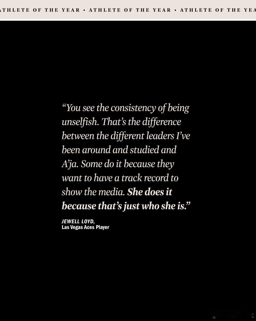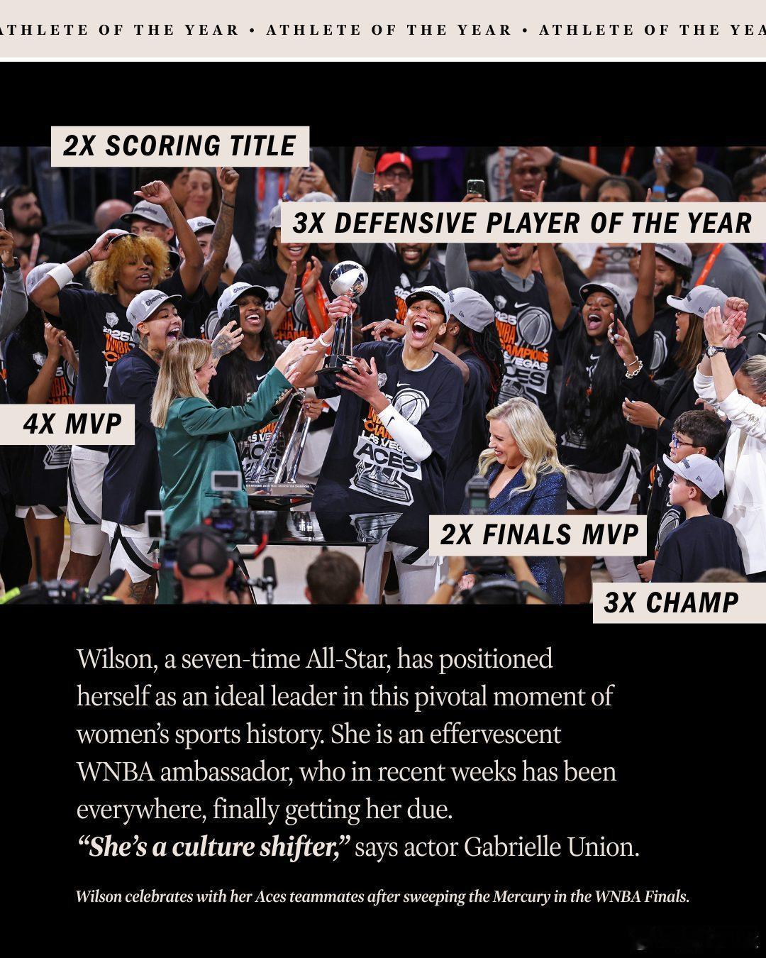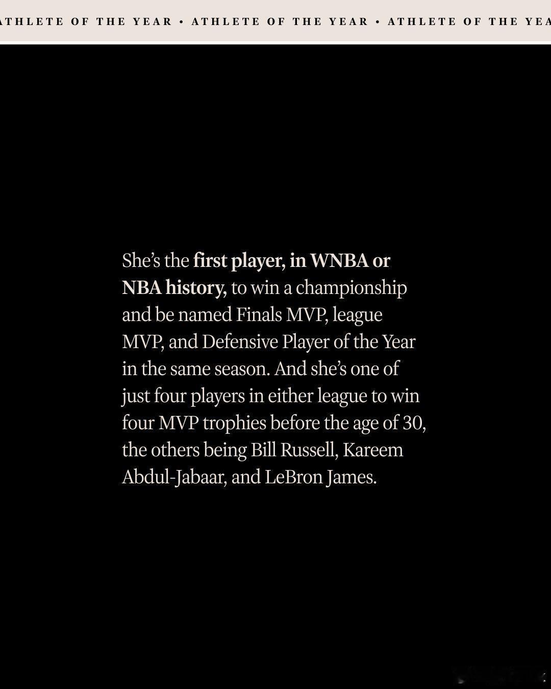 阿贾·威尔逊当选《时代》周刊2025年度运动员。1️⃣得分王(第二次);2️⃣5K——今年六月,她成为WNBA历史上最快达到5000分里程碑的球员;3️⃣DPOY,即年度最佳防守球员(第三次);4️⃣MVP,创纪录的第四次;5️⃣总决赛MVP(第二次);6️⃣总冠军(第三次)。她是WNBA和NBA历史上第一位在同一赛季赢得总冠军,并同时荣膺总决赛MVP、联盟常规赛MVP和年度最佳防守球员的球员。同时,她也是两个联盟中仅有的四位在30岁之前赢得四座MVP奖杯的球员之一,另外三位是比尔·拉塞尔、卡里姆·阿卜杜勒-贾巴尔和勒布朗·詹姆斯。新赛季篮不住詹姆斯