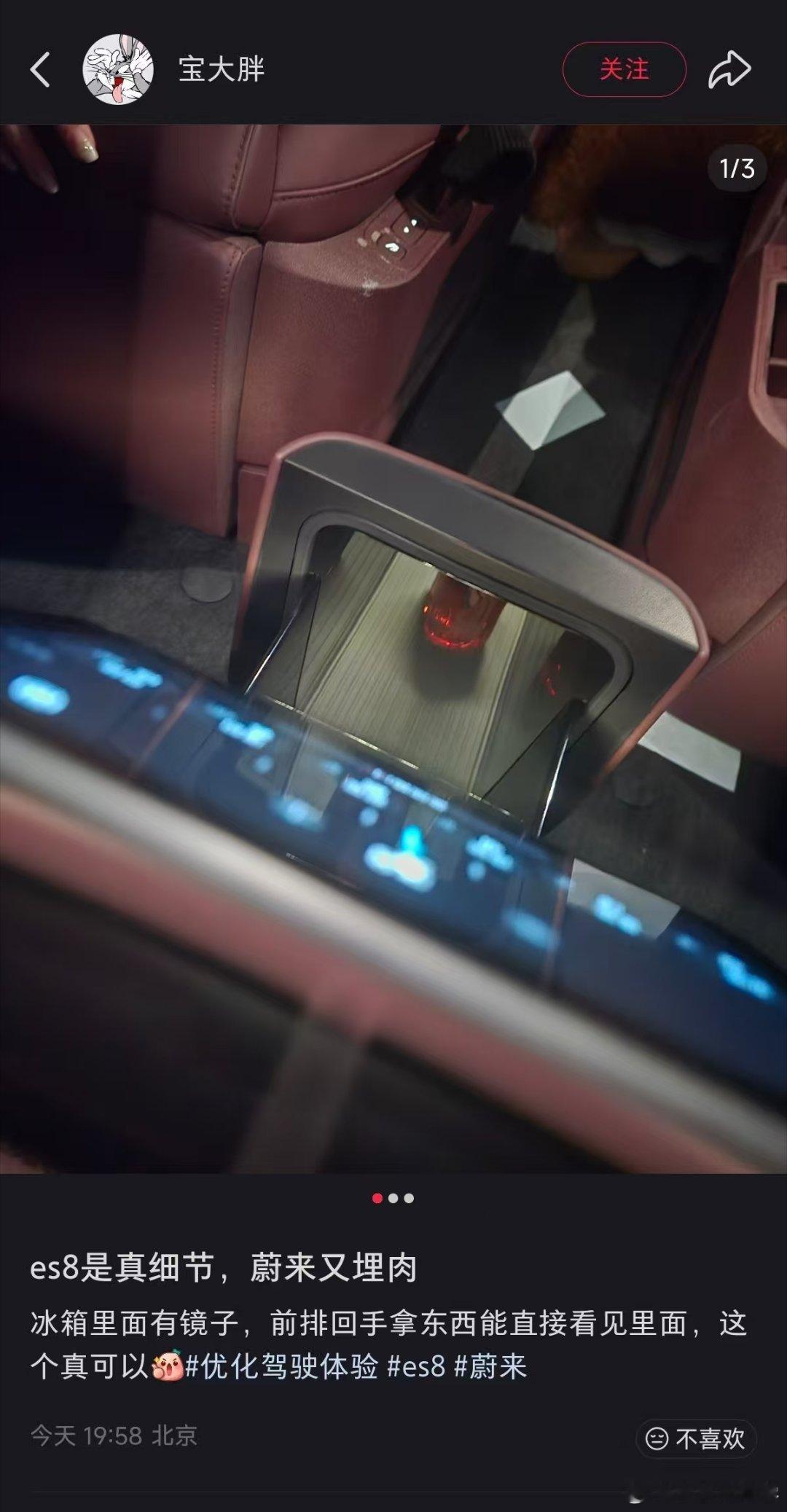 ES8的冰箱,竟然里面装了一个镜子,方便前排的司机去取物。我倒不觉得这是什么肉埋在饭里,因为镜子本身也不值多少钱,这都算肉了,神机芯片算什么?全域主动底盘是什么?三激光雷达算什么?这最多只算是个小肉丁啊……不过产品经理确实在实实在在思考如何让用户体验更好,而不是盲目跟风,先加一个冰箱方便卖车。水哥有话说