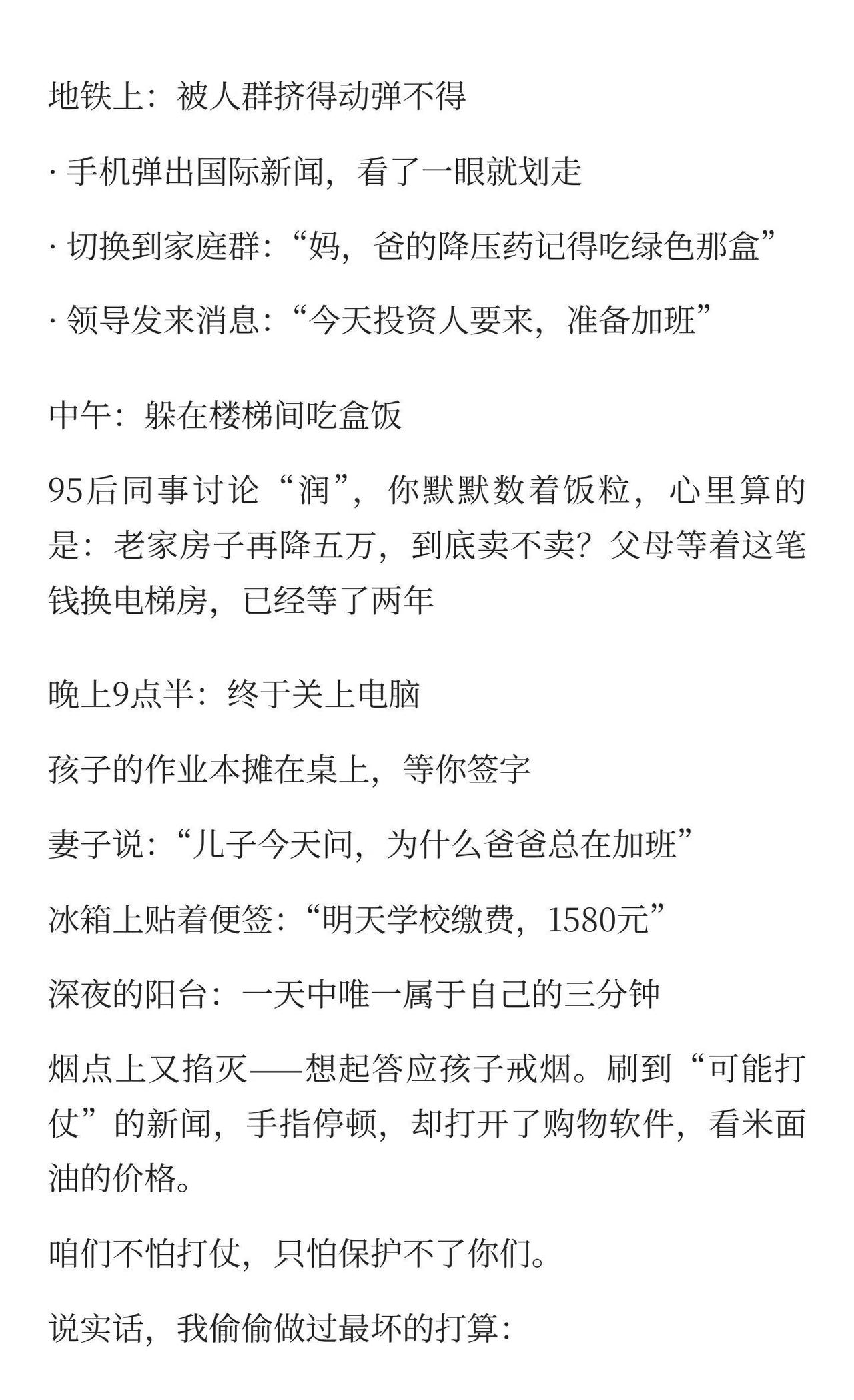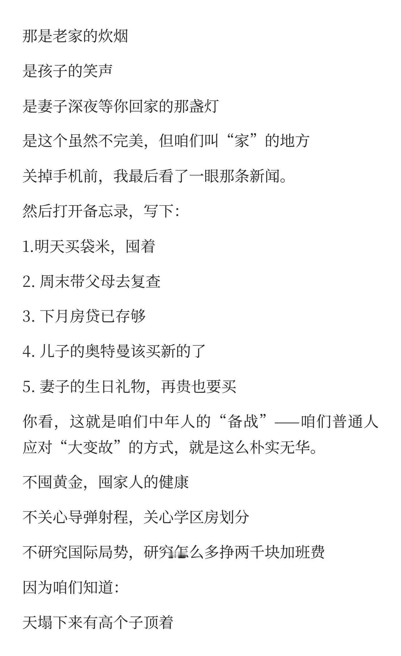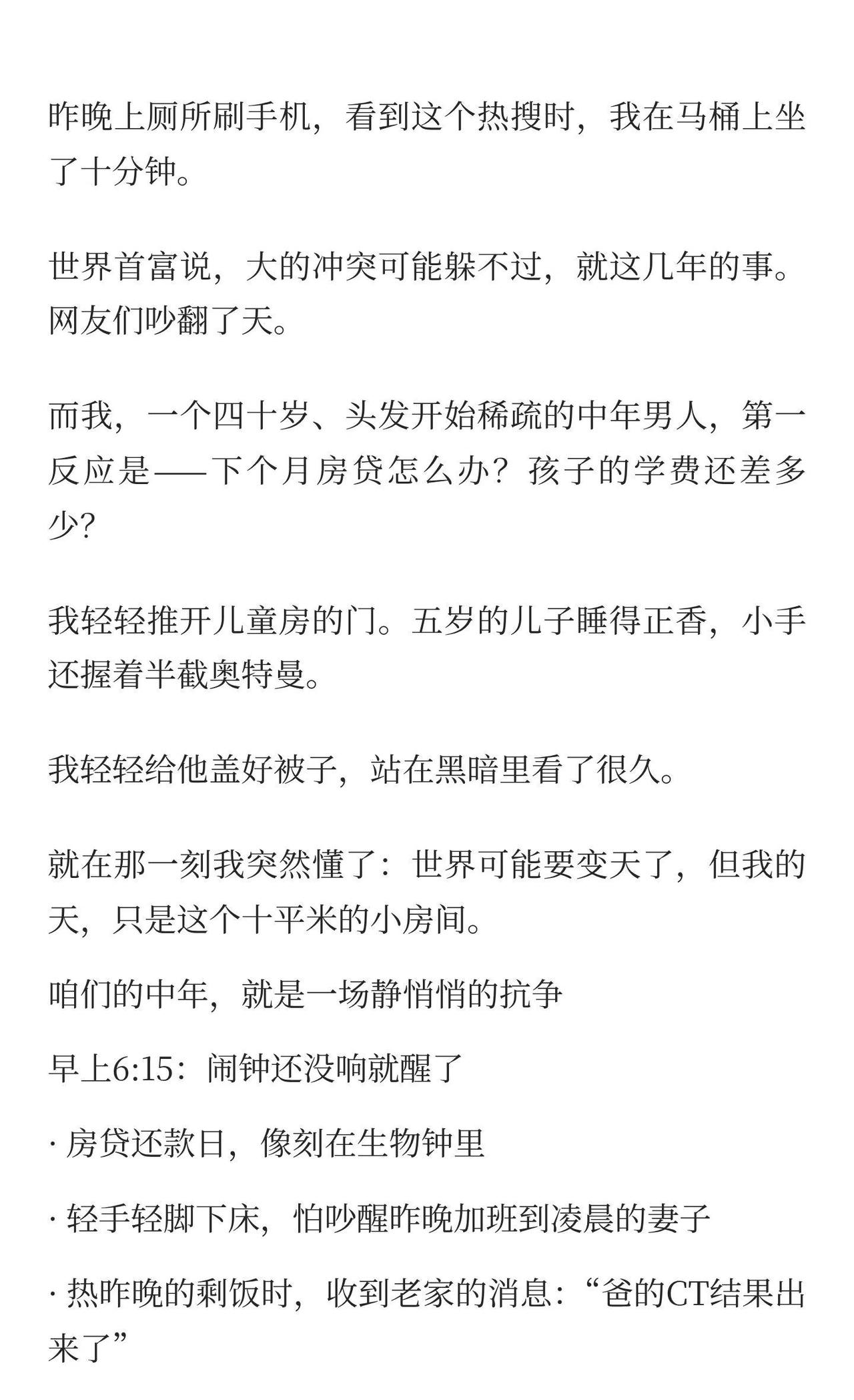 凌晨三点,马斯克预言要打仗。我一个中年父 中年生活充满琐碎与责任,房贷、教育、健康和家庭是日常重点。面对不确定性,我们既要应对外部挑战,也要守护内心平静与家庭安稳。平凡的日子里,我们默默坚持,只为守护那份平凡的幸福与爱。看国际形势知天下大事 愿世界没有战争 国际新闻 当今社会现象 愿世界再无战争 内卷与躺平 当下社会现状