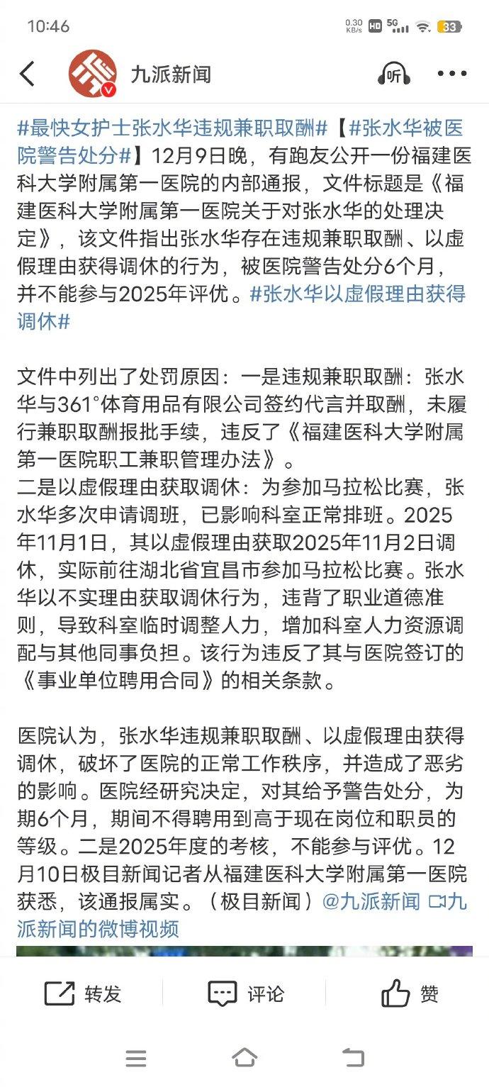 【#最快女护士张水华被医院警告处分#:指其在存违规兼职取酬、以虚假理由获得调休行