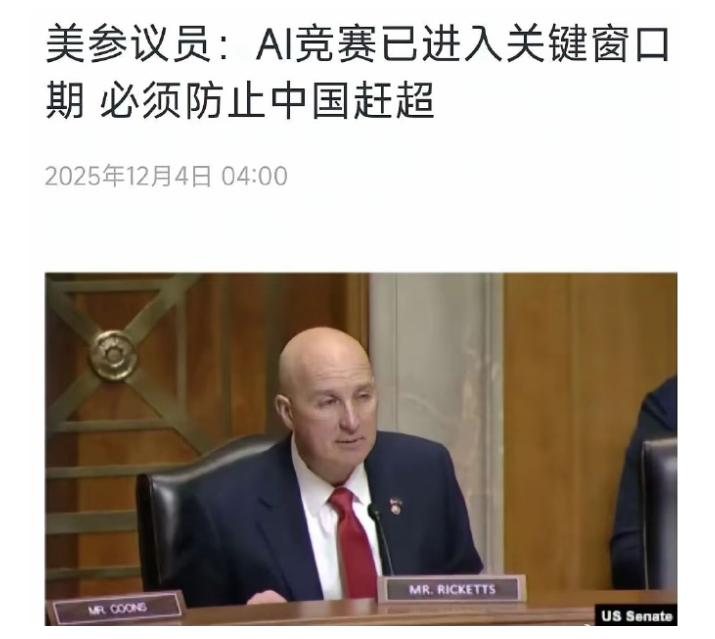 12月4日,美国参议员发狠了:AI领域绝不能被中方超越!当天,美国参议院国土安全与政府事务委员会下属的“联邦支出效率、财政责任与政府绩效”小组委员会举行了一场闭门听证会,主题直指“如何应对中国对美国人工智能领导地位的挑战”。主持会议的是该小组委员会主席、来自内布拉斯加州的共和党参议员皮特·里基茨,在开场发言中毫不掩饰地将中美AI竞争比作“新冷战时期的太空竞赛”——只不过当年的苏联换成了今天的中国,争夺的不再是轨道和月球,而是大模型、算力和AI生态的主导权。里基茨强调:“我们正处在一个关键窗口期。如果现在不采取果断行动,未来十年全球AI秩序将由中国统治。”他表示,在AI领域绝对不能被中方超越,否则麻烦大了。不过,现在双方走向了不同的路线,一个是注重应用场景,而另一个是注重创新技术。中国拥有全球最丰富的AI应用场景:从深圳的全自动港口到杭州的AI政务审批,从上海的智慧医疗影像诊断到成都的工业质检机器人,AI已深度嵌入实体经济。相比之下,美国AI企业虽在基础模型上强势,但受限于制造业空心化和数据隐私法规,工业场景部署缓慢。麦肯锡10月一份报告显示,中国AI在制造业的渗透率已达34%,而美国仅为19%。这才是美国参议院焦虑的根本原因。