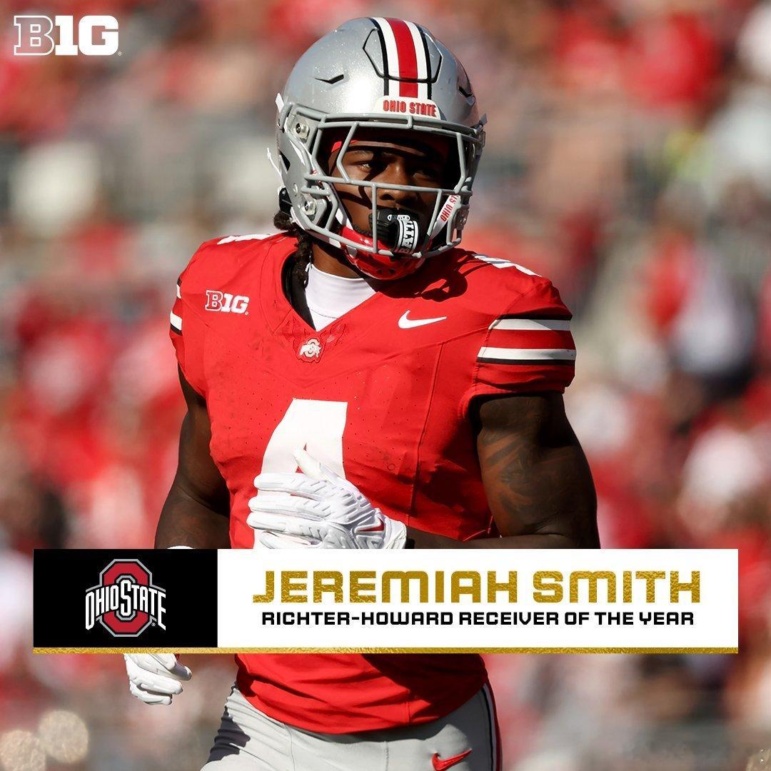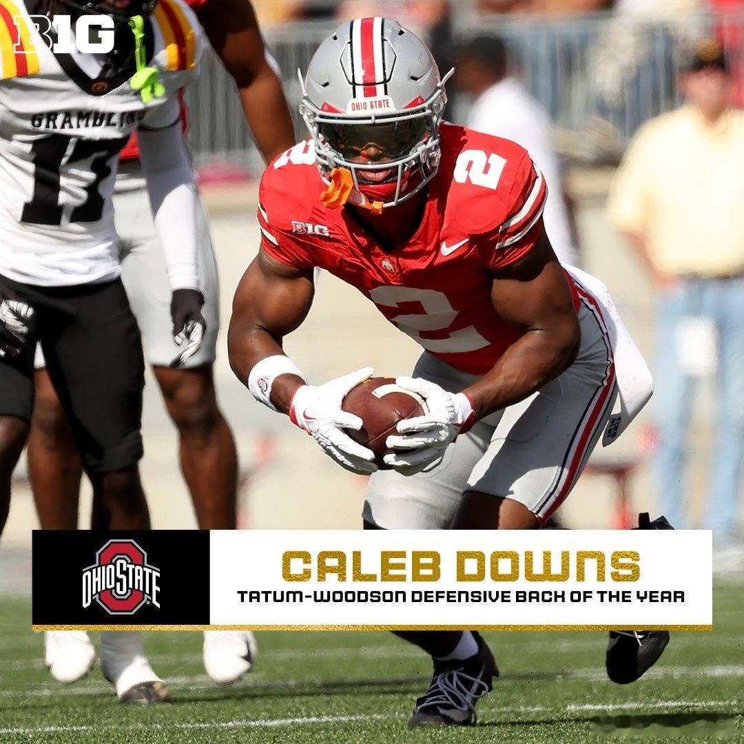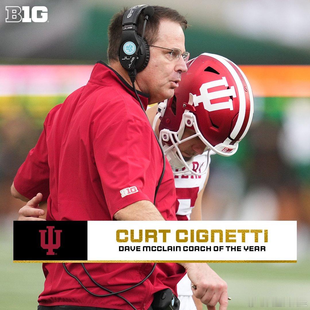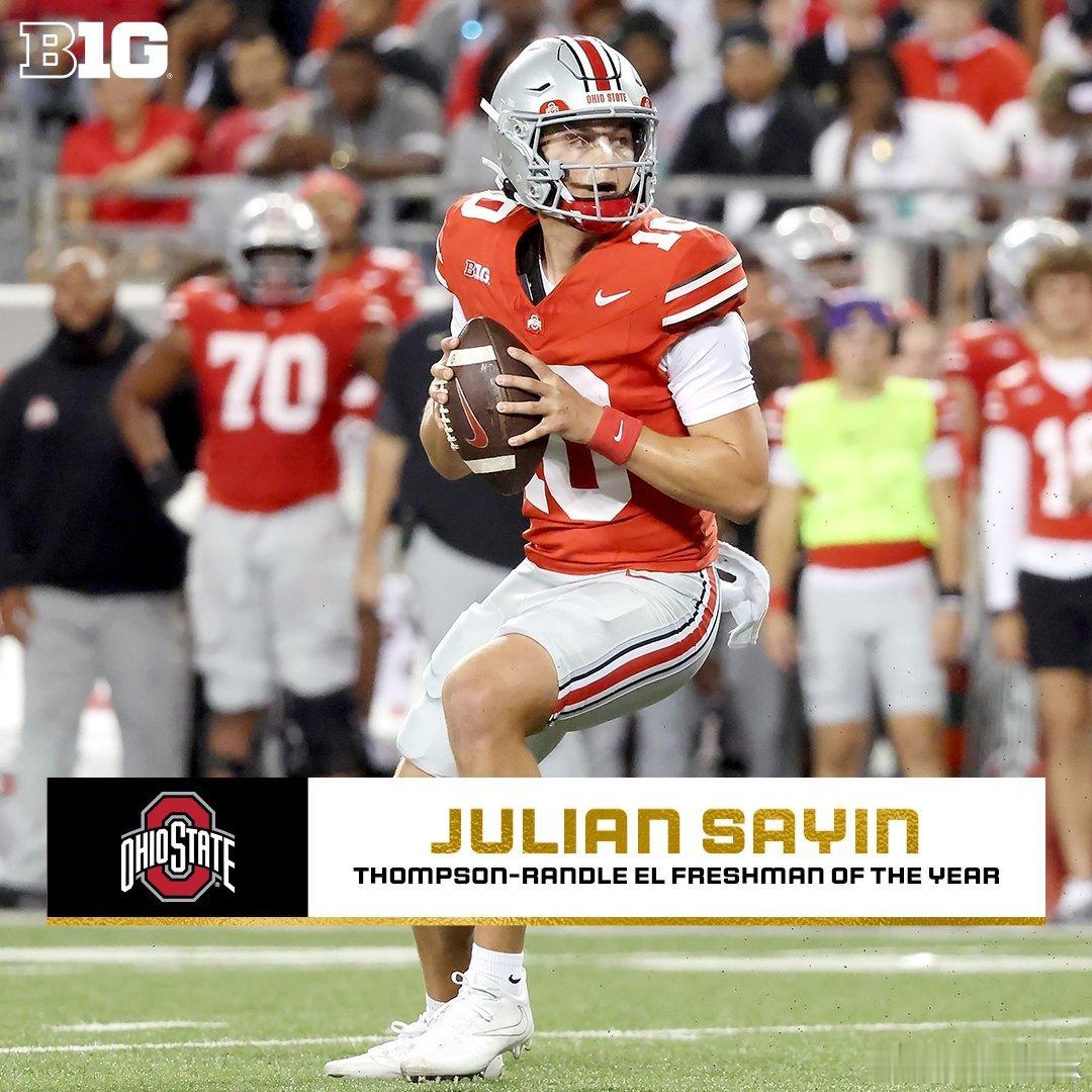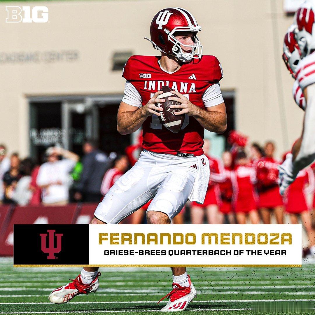 2025年Big Ten联盟赛季表现奖和最佳阵容公布。.年度最佳进攻球员:Fernando Mendoza,印第安纳大学。.年度最佳防守球员:Caleb Downs,俄亥俄州立。.年度最佳新生:Julian Sayin,俄亥俄州立。.年度最佳教练(教练投票+媒体投票):Curt Cignetti,印第安纳大学。.年度最佳四分卫:Fernando Mendoza,印第安纳大学。.年度最佳外接手:Jeremiah Smith,俄亥俄州立。.年度最佳近端锋:Kenyon Sadiq,俄勒冈大学。.年度佳佳跑卫:Emmett Johnson,内布拉斯加大学。年度最佳进攻线球员:Carter Smith,印第安纳大学。年度最佳防守线球员:Kayden McDonald,俄亥俄州立。年度最佳线卫:Arvell Reese,俄亥俄州立。年度最佳防守后卫:Caleb Downs,俄亥俄州立。年度最佳踢球手:Nico Radicic,印第安纳大学。.年度最佳弃踢手:Ryan Eckley,密歇根州立。年度最佳回攻手:Kaden Wetjen,爱荷华大学。