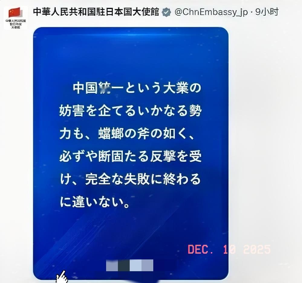12月9日,中国驻日本大使馆发布了一张海报,让日本网民非常“不爽”。这张海报是在社交媒体上发布的(下图),上面用日语写道:“任何势力胆敢阻挠中国统一大业,都是痴心妄想、螳臂挡车,注定失败!” 海报是严肃的,但亮点是日本网民的评论,日本网民纷纷在海报下面发言说“地震了,太忙了,你别发了”、“有本事地震后再发”、“先放着,地震后再来评论”、“现在发这个,合适吗”等等。 日本网民的不满纯属找错了发泄对象,使馆这波操作不仅合适,还特别有必要。要知道,海报发声的根源是日本首相高市早苗公然发表涉台错误言论,暗示要武力介入台海,这可是触碰中国红线的挑衅。 而且中方从没顾此失彼,地震后第一时间就发布了多语种提醒,让在日中国公民注意避险,人道主义关怀一点没少。台湾问题是中国内政,日本地震是自然灾难,两者根本不是一回事,不能用地震当借口掩盖涉台挑衅的事实。 主权问题没有“看时机”的说法,该发声时就得硬气,这和对受灾民众的同情并不冲突。日本与其纠结海报发布时间,不如先管好自己的政客,别再干涉中国内政。你觉得面对他国挑衅,该及时反击还是选择隐忍?