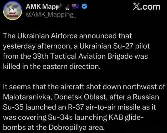 俄罗斯空天军的一架苏-35战斗机在为苏-34护航时,在顿涅茨克上空发射了一枚R-37远程空空导弹,击落了一架乌克兰空军的苏-27S战斗机,乌军飞行员伊万诺夫中校阵亡。   这已经不是 R-37M 第一次在俄乌战场露脸。自 2022 年冲突爆发以来,这款被俄军飞行员称为 “长臂猎手” 的导弹,已经确认击落至少 6 架乌军战机,其中包括 4 架苏 - 27 和 2 架米格 - 29。但这次在顿涅茨克的猎杀格外有代表性:它清晰展现了俄军如何用 “老战机 + 新导弹” 的组合,在制空权争夺中占据绝对主动。   要理解这场空战的含金量,得先说说 R-37M 这枚导弹的 “前世今生”。早在上世纪 80 年代,苏联三角旗设计局就以 R-33 导弹为基础,研发出 R-37 空空导弹,专门配给米格 - 31 截击机用来猎杀美军轰炸机和预警机。   但当时的技术局限太大,导弹笨重且制导精度差,直到 2014 年改进型 R-37M 正式服役,才真正成为 “空中杀手”。相较于老款,R-37M 不仅重量减轻到 510 公斤,还换上了激光陀螺仪惯性制导 + 主动 / 半主动雷达复合制导的 “火眼金睛”,就算被敌方电子干扰,也能靠着惯性制导直奔目标。   这次苏 - 35 挂载的正是这款改进型导弹。从参数上看,它的性能堪称 “碾压级”:全长 4.06 米的弹体里藏着 60 公斤的高爆破片战斗部,相当于 120 枚手榴弹的威力,只要擦着就足以撕碎战机;6 马赫的最大速度比子弹还快,从发射到击中 300 公里外的目标,不过两三分钟时间。   在 15 米到 25000 米的高度区间内,还能做出 8G 的过载机动,就算乌军飞行员玩出极限规避动作也很难摆脱。更关键的是,俄军已经把它适配到苏 - 35、苏 - 30SM2 甚至苏 - 57 等多款战机上,彻底摆脱了只能依赖米格 - 31 的限制。   回到顿涅茨克的空战现场:当时俄军的苏 - 34 轰炸机正在执行对地打击任务,这款被乌军称为 “鸭嘴兽” 的战机是俄军空袭主力,每天要投下大量滑翔制导炸弹攻击前线工事。为了防止乌军战机拦截,苏 - 35 特意挂载 R-37M 担任护航。   当预警机传来 “发现苏 - 27S 接近” 的信号时,苏 - 35 飞行员根本没进入目视范围,就在 130 公里外按下了发射按钮 —— 这个距离远超乌军战机的雷达探测范围,苏 - 27S 直到导弹逼近时才收到告警,但此时再做机动已经晚了。   伊万诺夫中校的牺牲对乌军是沉重打击。能驾驶苏 - 27 这种重型战机的都是资深飞行员,乌军原本就稀缺的空战人才又折损一员。这种 “超视距猎杀” 正在彻底瓦解乌军的空中抵抗。   过去乌军还能靠苏 - 27 执行纵深打击任务,曾在 60 公里外投弹摧毁俄军指挥所,但现在有了 R-37M 的威胁,乌军战机只要升空就可能被锁定,连靠近前线都变得异常危险。   从战术层面看,俄军这招打得相当精明。苏 - 34 虽然载弹量大、航程远,但机动性差,很容易成为拦截目标。而苏 - 35 挂载 R-37M 后,相当于为对地打击编队撑起了 “远程防护网”。   这种 “轰炸机主攻 + 战斗机远程护航” 的组合,完美发挥了各自优势:苏 - 34 可以放心投弹,苏 - 35 不用冒险格斗,只用在安全区域 “放冷箭”。反观乌军,由于缺乏远程空空导弹和先进预警机,只能被动陷入 “看不见、跑不掉” 的困境。   不过这场胜利也暴露了俄军的隐忧:R-37M 虽然性能强悍,但造价不菲,无法大规模量产。   目前俄军每月能生产的导弹数量有限,面对乌军残存的数十架战机尚可应对,但若未来西方援助更先进的战机,这种优势可能被削弱。而且它依赖预警机提供目标指引,如果失去空中态势感知支持,命中率会大幅下降。   但无论如何,R-37M 已经改写了俄乌空战的规则。过去那种战机狗斗的热血场面越来越少,取而代之的是 “超视距决胜” 的冷酷现实。   对乌军来说,就算后续获得 F-16 战机,若没有配套的远程导弹和电子战系统,恐怕也难逃被 R-37M 猎杀的命运 —— 毕竟之前乌军的 F-16 就曾被俄军导弹击落,先进战机在代差武器面前也难掩脆弱。   这场发生在顿涅茨克上空的空战,本质上是新旧空战理念的碰撞。俄军用苏联时期的技术底子,通过升级改造打出了现代化战果;而乌军则困在 “传统空战思维” 里,靠着有限的装备苦苦支撑。   当苏 - 27S 的残骸在地面燃烧时,它不仅标志着一名飞行员的牺牲,更预示着:在远程精确武器面前,单纯依靠战机机动性的时代已经落幕。