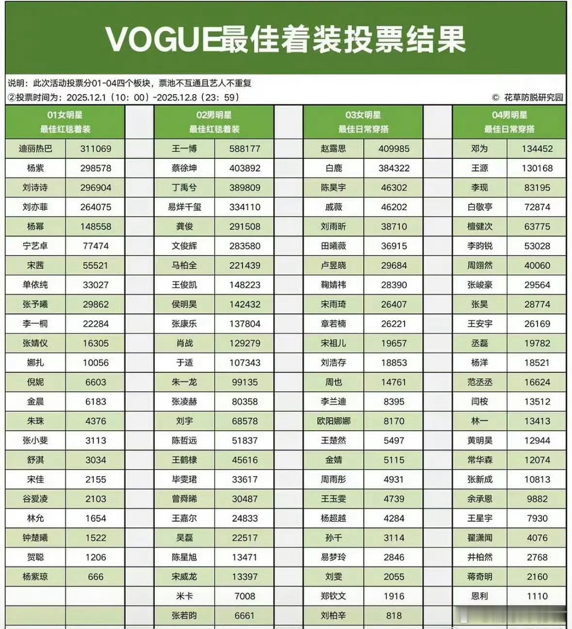1️⃣女明星最佳红毯着装前五名:迪丽热巴、杨紫、刘诗诗、刘亦菲、杨幂2️⃣男明星最佳红毯着装前五名:王一博、蔡徐坤、丁禹兮、易烊千玺、龚俊3️⃣女明星最佳日常穿搭前五名:赵露思、白鹿、陈昊宇、戚薇、刘雨昕4️⃣男明星最佳日常穿搭前五名:邓为、王源、李现、白敬亭、檀健次