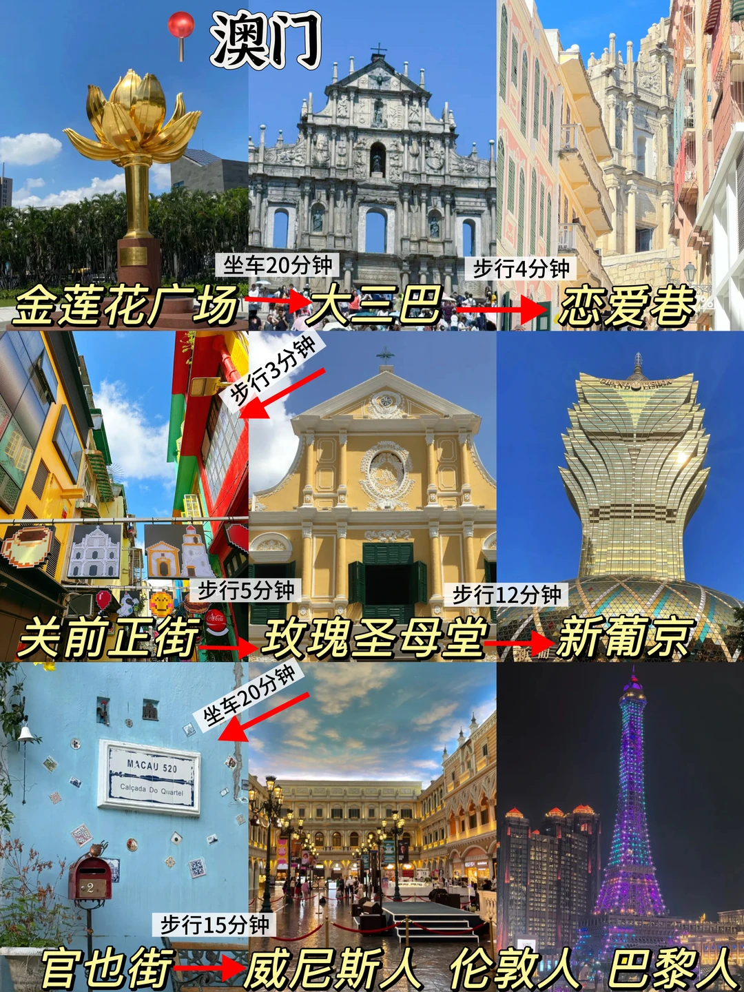 💜 Day3路线:金莲花广场➡️大三巴➡️恋爱巷➡️关前正街➡️玫瑰圣母堂➡️新葡京➡️官也街➡️威尼斯人➡️伦敦人➡️巴黎人