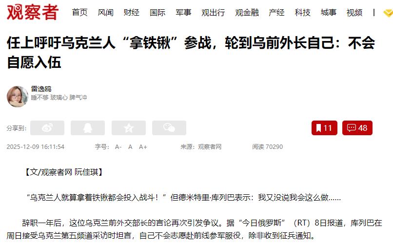 “乌克兰人就算拿铁锹都得去战斗!”说实话,乌克兰之所以会变成现在这样,原因不在俄罗斯,也不在美国,更不在欧洲,源头出在他们自己身上!说开头那句话的人是乌克兰前外长库列巴,他鼓励所有的乌克兰平民都去战斗,可轮到自己的时候,他却改口了:“我没说我要去。” 据媒体12月9日报道:库列巴是在辞职一年后接受的采访,他接受采访时直言,除非收到征兵令,否则绝不会主动去前线打仗。 说实话,看到这新闻我真觉得讽刺,当初在国际上喊着让全民抗战的高官,催别人拿命拼命时义正辞严,到自己该当兵了,就找借口躲着,这种双重标准也太让人不齿了。 要说这事儿多讽刺,先说说库列巴的身份。2020到2024年他当乌克兰外长,是政坛年轻的核心人物,天天在国际上喊口号:一会儿叫海外乌克兰人赶紧回国打仗,一会儿放狠话,说就算西方不援助,乌克兰人拿铁锹也能接着打。 那时候大家还觉得他这话特提气,是乌克兰人顽强的象征,谁能想到,他就光让别人去拼,自己压根没打算兑现。 库列巴说自己不主动入伍,是因为“已经为战争忙了两年多”。这话听着就可笑,前线的普通士兵哪个不是抛家舍业在玩命? 有的才二十来岁,本该好好过日子,却要在战壕里躲炮弹;有的上有老下有小,被征兵令逼得离开家,能不能回来都不一定。 库列巴就坐在办公室里发发声、跑跑路,就觉得自己付出够多了,普通人数命去拼倒成了应该的? 更关键的是,他说“收到征兵令就不逃”根本是空话,在乌克兰,像他这样的前部长,压根就不在征兵范围内,所谓“待命”就是给自己找台阶下。 不光库列巴这样,乌克兰那些当官的、有钱的精英,大多都这德行,平时把“保卫家园”挂嘴边,催着老百姓上战场,轮到自己和家人,早就找好退路了。 就说基辅市长克利奇科,一边喊着把征兵年龄从25岁降到22岁,让更多年轻人去送死,一边让自己两个身强力壮的儿子躲在英美享福,一个在伦敦做金融,一个在洛杉矶学电影,朋友圈全是吃喝玩乐的照片。 有人问他为啥不让儿子参军,他还理直气壮说儿子是外国公民,不用当兵,跟库列巴一样虚伪。 跟精英们躲清闲相反,普通老百姓被征兵逼得走投无路。现在乌克兰征兵早就不是自愿的了,就是抢人。 一开始征18到60岁的男人,后来死的人太多,兵不够了,就把年龄一降再降,到最后连60岁以上的老人都要征。 更过分的是,征兵的直接在商场、地铁站拦人,只要没证明,当场就抓走,连跟家人告别的机会都没有。 据统计,乌克兰军队死的、失踪的加起来都快40万了,多少家庭就这么散了? 农村里寡妇越来越多,老人没人管,孩子成了孤儿;城市里800万人逃到欧洲当难民,很多人再也回不了家。 联合国说,已经有一万多平民死了,三万多人受伤,而且这个数字还在一个劲涨。这些都是普通家庭的血泪,可那些喊着“拿铁锹战斗”的精英,从没让自己家人受这份罪。 现在乌克兰老百姓都看清这双重标准了。有个调查显示,一半多的人都能理解为啥有人逃征兵,毕竟没人想死,尤其是靠近前线的地方,七成的人都能理解。 大家心里也矛盾,知道逃兵不光彩,可更知道上了前线大概率就是送死,凭啥精英们躲在后方享福,要普通人家的孩子去填战壕? 说到底,库列巴说的和做的不一样,暴露的是乌克兰当官的虚伪和自私。他们把“保卫国家”当口号绑架老百姓,自己却攥着特权,让家人远离战火。 所谓“全民抗战”,从来都是让平民抗战,精英们就在后方享受西方援助,顺便发战争财。这样只让老百姓牺牲、当官的免责的国家,根本凝聚不起力量。 库列巴当初喊“拿铁锹战斗”的时候,肯定没料到,这把铁锹最后会砸烂自己的名声,也砸破了乌克兰本来就脆弱的人心。 现在乌克兰最该搞清楚的不是怎么向西方要援助,而是该问问那些当权者:当初让别人拿命拼的你们,现在敢不敢拿起武器,跟普通士兵一起站到前线去?