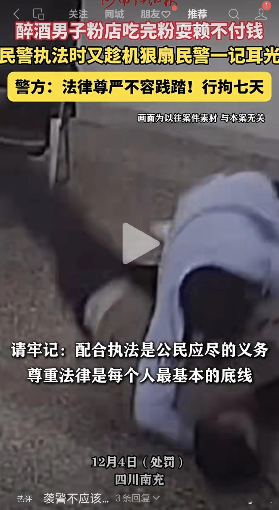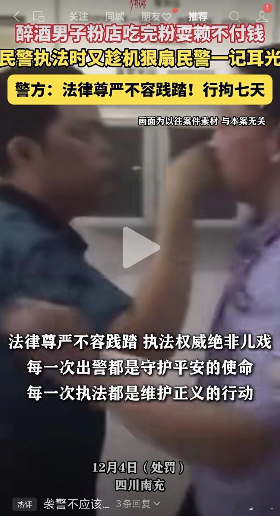 吃碗粉想当“霸王”,扇警察耳光后,他喜提“拘留所七日游”! 这年头奇葩事真不少,但这么“虎”的人还真不多见——有人吃了碗粉不想给钱,警察来了不但不怂,竟反手给了民警一记耳光。 结果嘛,这位“壮士”很快收到了警方的“豪华大礼包”:拘留所七日游,包吃包住,附赠银色手镯一对。 事情就发生在12月3日,四川南充高坪区一家粉店。 一位蒋姓男子吃完粉后一抹嘴,抬腿就要走人。店主赶忙拦住:“大哥,您还没结账呢!” 谁知这位大哥醉眼一瞪:“吃你碗粉是给你面子!”两人就这么杠上了。 民警接到报警赶到现场,一看是消费纠纷,便依法要传唤蒋某回所里调解。 没想到,蒋某酒劲上头,竟突然抬手“啪”地一声,结结实实扇了民警一记耳光。这一巴掌,直接把“吃饭赖账”升级成了“暴力袭警”。 民警脸上火辣辣,心里更是一阵无语:我出个警,还附赠面部按摩? 随即果断出手,将蒋某控制住带回派出所。酒醒之后,蒋某恐怕肠子都悔青了——为了一碗粉钱,换来七日拘留。 警方这次反应迅速,启动民警维权机制,多部门联合督办。 第二天,处罚结果就出来了:蒋某因阻碍执行职务,被依法处以行政拘留七日。 一碗粉钱不过十几二十块,如今却用七天自由来“买单”,这“折扣”打得真是血亏。 这件事也给所有人提了个醒:警察执法不是“商量”,是法律给的权力。你觉得自己能打?法律比你更能“打”。你觉得喝酒能壮胆?法律专治各种“不服”。 撒泼、耍赖、动手,看似逞了一时之快,实则全是给自己“加刑”。 有网友调侃: “这下好了,拘留所里管饭,不用愁付钱了。” “这可真是酒壮耸人胆啊!” 话虽诙谐,道理却严肃:法律红线碰不得,警察执法更是开不得玩笑。否则,下一顿“免费饭”在哪吃,可就由不得你选了。 还是那句老话:做人要实在,吃饭要付钱,遇事要冷静,见警要配合。否则,法律会帮你好好“清醒清醒”。 信息来源于河南法治报,侵联删!