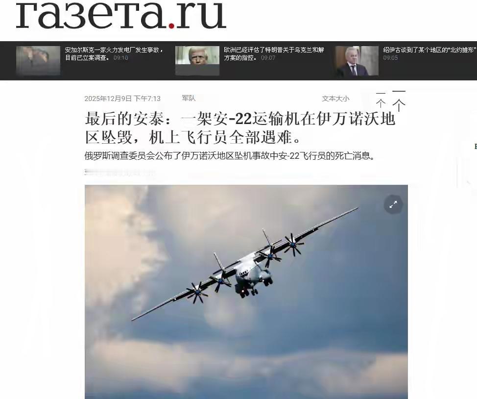 俄安-22运输机维修后试飞坠毁,7名机组人员全部遇难 当地时间12月9日,俄罗斯国防部一架安-22运输机在俄罗斯伊万诺沃州乌沃茨科耶水库附近坠毁,机上共有7名机组人员全部遇难。 事故一发生,俄罗斯紧急情况部立刻派救援人员赶去现场。消防和搜救队忙着清理飞机残骸,查找事故原因。现场看着特别揪心,机身碎成好多块,散在水库周边一大片地方,事发地已经临时封起来了。 俄调查委员会当天就介入调查,初步只说人都遇难了,没说具体为啥坠毁。大家都猜,维修完试飞就出事,维修质量合不合格、检查流程到不到位,肯定是重点查的地方。 安-22不是普通军机,是全世界最大的涡桨运输机之一。从上世纪60年代就开始用,现在俄军手里剩下的不到10架,对军事运输特别重要。这次坠毁,损失是真的大。 这款飞机用了五十多年,机身老化、零件磨损都是公开的问题。俄军这几年资源紧张,装备维护的钱和技术都不够,很多老飞机只能凑合用,安全隐患一直没解决。 2025年到现在,俄军已经出了8起军机坠毁事故,20多个人没了,有运输机也有战斗机。老装备维护不到位的问题反复出现,俄罗斯国内很多人都在关注这事。 维修后试飞本来是为了保证飞行安全,偏偏在这时候出事,让人忍不住怀疑维修环节没做好。航空专家说,试飞出事大多和维修马虎、检查不仔细有关,这类事故其实能避免。 之前俄军有架直升机,维修后第一次飞就出故障,迫降时损毁严重。当时查出来是维修时零件装错了,这么明显的失误,根本不该发生。 去年俄空军一架老式轰炸机,也是维修后试飞时坠毁,最后查出来是维修的零件不匹配。同样的悲剧再发生,说明俄军装备维修的问题根本没彻底改。 这次遇难的7名机组人员都是老飞行员,经验特别足,不少人飞了超过2000小时,经常完成难活重活,是俄军飞行队伍的核心力量。他们没了,家里人崩溃,俄军战力也受影响。 事故消息传开,俄罗斯网友都特别难过,纷纷留言悼念遇难人员。大家也怒批军方对装备安全不上心,要求全面排查所有老军机隐患,别再让英雄白牺牲。 俄国防部说会彻底调查、严肃追责,也会好好安抚遇难者家属。可再周全的善后,也换不回7条鲜活的生命,这场悲剧带来的痛,根本没法用东西弥补。 军机安全从来不是小事,关系着飞行员的命,也影响国防安全。老装备该怎么换,维修流程该怎么盯紧,这些事俄军得赶紧解决,别再让类似的悲剧重演。 维修好的飞机没平安落地,7名勇士再也回不来了。背后藏着的装备维护漏洞,比事故本身更让人警惕,安全底线绝不能松。 各位读者你们怎么看?欢迎在评论区讨论。