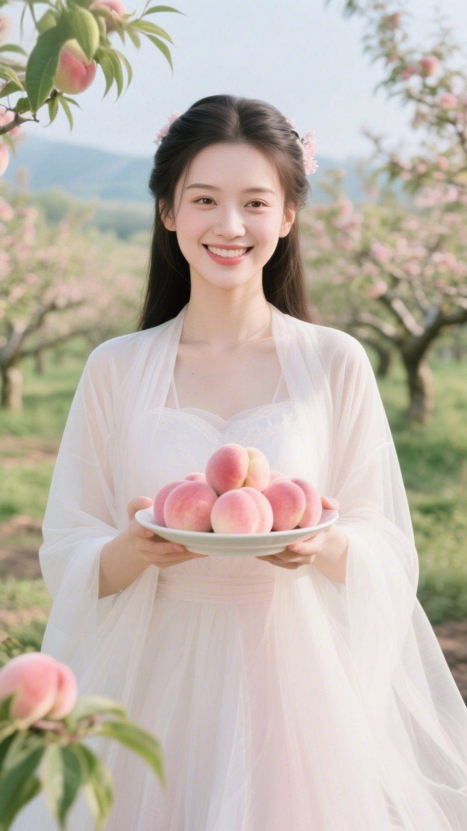 桃间风 风裹着桃香漫过枝桠时,我捧着满盘粉润的鲜果,立在漫山的清甜里。 薄纱沾了晨露的柔,发间轻缀的花片,是春遗落的星子。抬眼是云栖山尖的淡,低头是果儿裹着霞色的粉——像把半坡的晴光都盛进了瓷盘。 风过处,叶声摇落几缕甜,沾在袖角不肯散。原来最软的时光,是鼻尖裹着桃香,眼底映着山青,连呼吸都浸着风的暖。 这一瞬忽然懂了,为什么春总恋着果林:当花酿成清甜,当风裹着温柔,所有寻常光景,都成了浸在软意里的好。 春日桃林 治愈日常