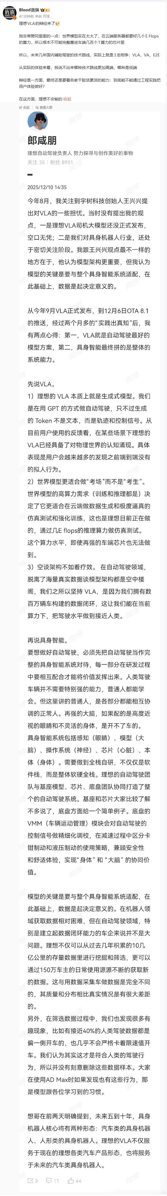 随便看了下,通篇都是含糊其词偷换概念:华为ADS的云端训练算力,早在9月已经宣布达到45Eflops了,那请问理想是多少呢?云端训练只要叫世界模式那就是一样吗?大学还分个清北C9、92、一二三本呢。理想至今总销量不过150万、带智驾的车型大概百来万辆,哪来的数百万辆构建的数据闭环?更搞笑的是,说统计有接近40%的人类驾驶数据都是偏一侧开车的,有没有可能是因为人本身是坐在一侧开车、而这40%的人空间感路感不够好呢?真难为艹老师还能厚着脸皮硬吹