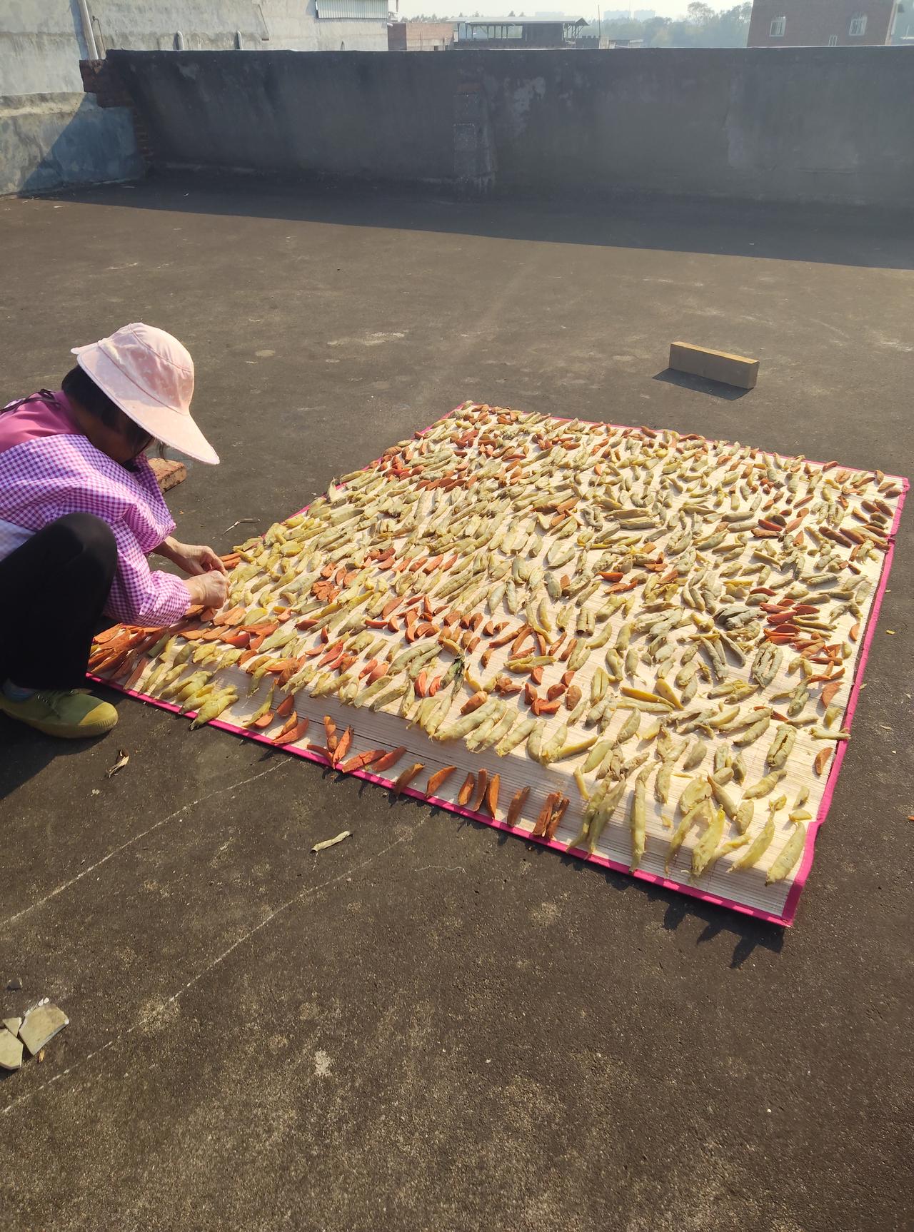 女儿总是抱怨, 外面买的红薯干不好吃! 婆婆这几天可忙啦, 天一亮就到天台铺开大竹匾, 把蒸软的红薯切条摆得整整齐齐。 太阳一晒,金黄的条儿泛着甜香, 她蹲那儿翻翻面,连皱纹里都裹着笑。等晒得韧韧糯糯,抓一根嚼, 满嘴都是烟火气的甜! 这哪是红薯干,是婆婆攒的好味道呀 红薯干自制 红薯干老式 红薯地瓜干 地瓜干晒制