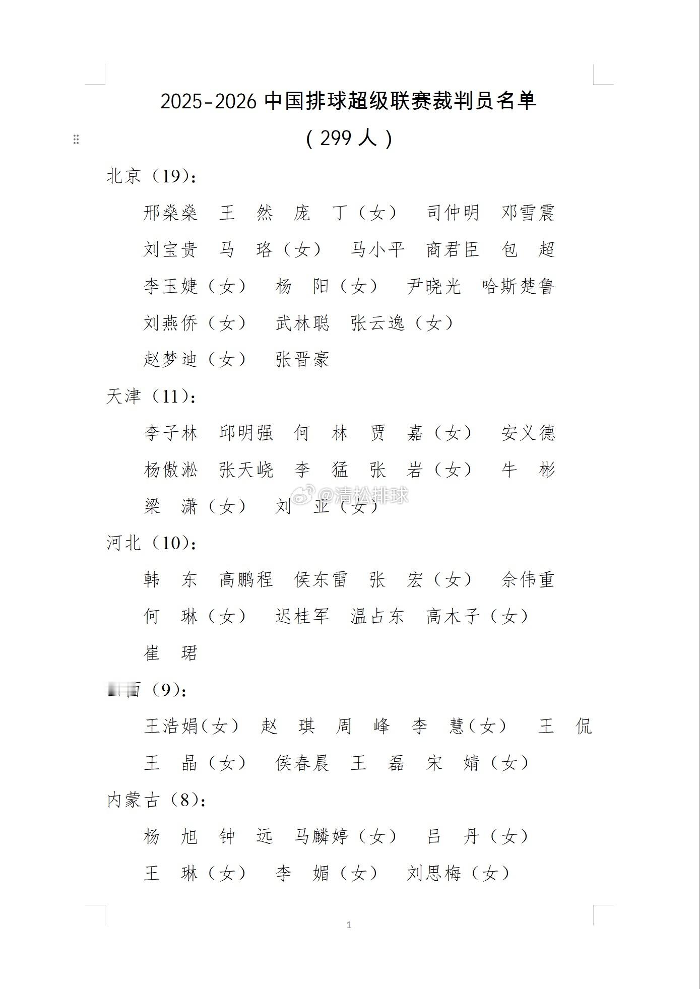 2025-2026赛季中国排球超级联赛裁判员名单(299人)清松带你看排球2025-2026中国女排超级联赛2025-2026中国男排超级联赛