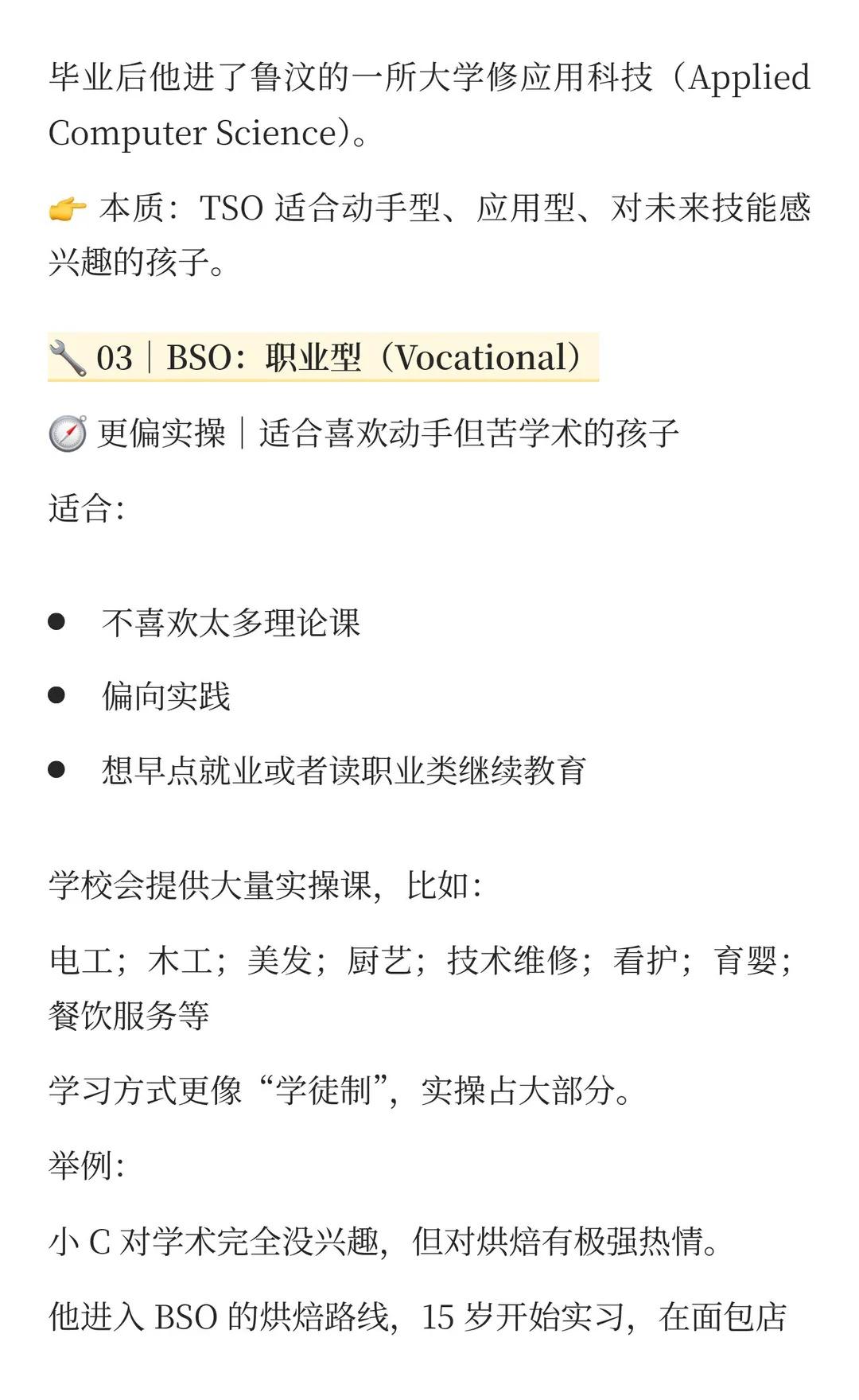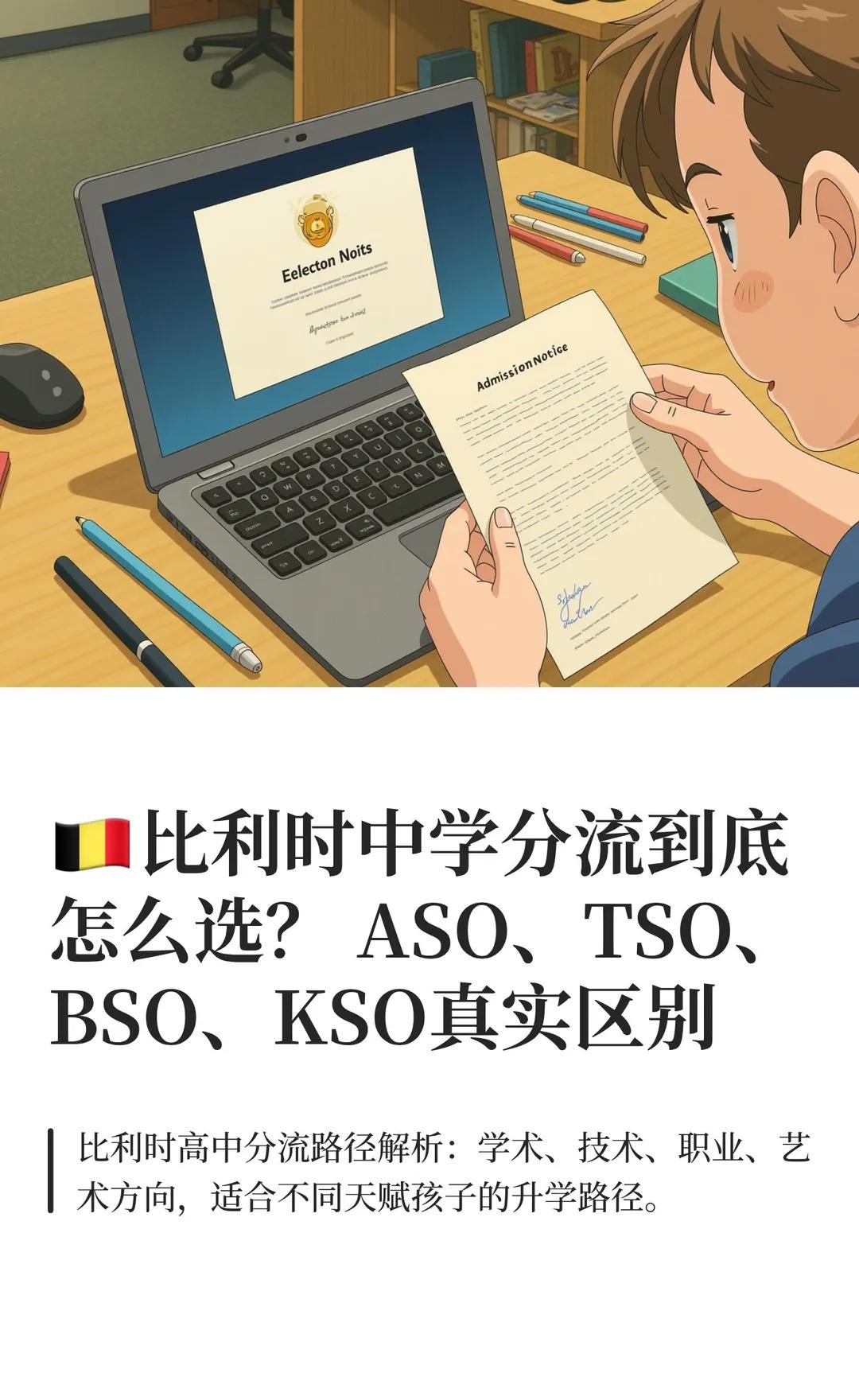 🇧🇪比利时中学分流到底怎么选? ASO、TSO、B 比利时教育提供四种路径:ASO(学术型)、TSO(技术型)、BSO(职业型)和KSO(艺术型),适合不同兴趣和能力的孩子。 ASO适合理论强、学习自驱力高的学生; TSO强调理论与实践结合; BSO适合动手能力强的学生; KSO适合艺术天赋明显的学生。 中考分流 比利时教育 比利时 圈 欧洲华人