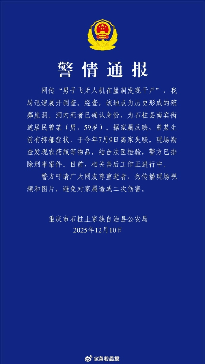 #发现干尸地点为历史形成的殡葬崖洞#【重庆警方通报#男子飞无人机时在崖洞中发现干尸#:死者曾某(男,59岁)生前有抑郁症状,7月离家失联】石柱土家族自治县公安局12月10日通报:网传“男子飞无人机在崖洞发现干尸”,该局迅速展开调查。经查,该地点为历史形成的殡葬崖洞。洞内死者已确认身份,为石柱县南宾街道居民曾某(男,59岁)。据家属反映,曾某生前有抑郁症状,于今年7月9日离家失联。现场勘查发现农药瓶等物品,结合法医检验,警方已排除刑事案件。目前,相关善后工作正进行中。#崖洞发现干尸博主称已找到家属#