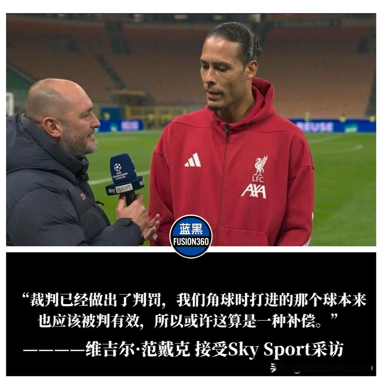 范迪克赛后神回复!直言点球是“补偿”,一句话扯下欧冠遮羞布 面对迪马齐奥递过来的话筒,利物浦队长范迪克没有选择常规的“外交辞令”,而是脸上带着一丝意味深长的微笑,直接摊牌了。赛后混合采访区这短短几秒钟的交锋,比场上的90分钟更具黑色幽默感,荷兰人显然看透了这场比赛的本质。 当被问及“作为后卫如何看待那个点球”这一敏感话题时,范迪克语出惊人:“裁判既然给了,那就是给了。但别忘了,我们之前角球进的那球本该有效,所以这或许就是一种补偿。”这一句“补偿”,直接把欧冠裁判组维持场面平衡的潜规则摆上了台面。 这才是顶级球员的顶级理解。范迪克不仅委婉地抗议了科纳特被吹掉的进球,还顺带把“获利”的国米择了出来——这不是对手的问题,是裁判在搞“收支平衡”。这种“找补式”执法,往往是比赛支离破碎的根源,看似两不相欠,实则两头不讨好。国际米兰 💙🖤