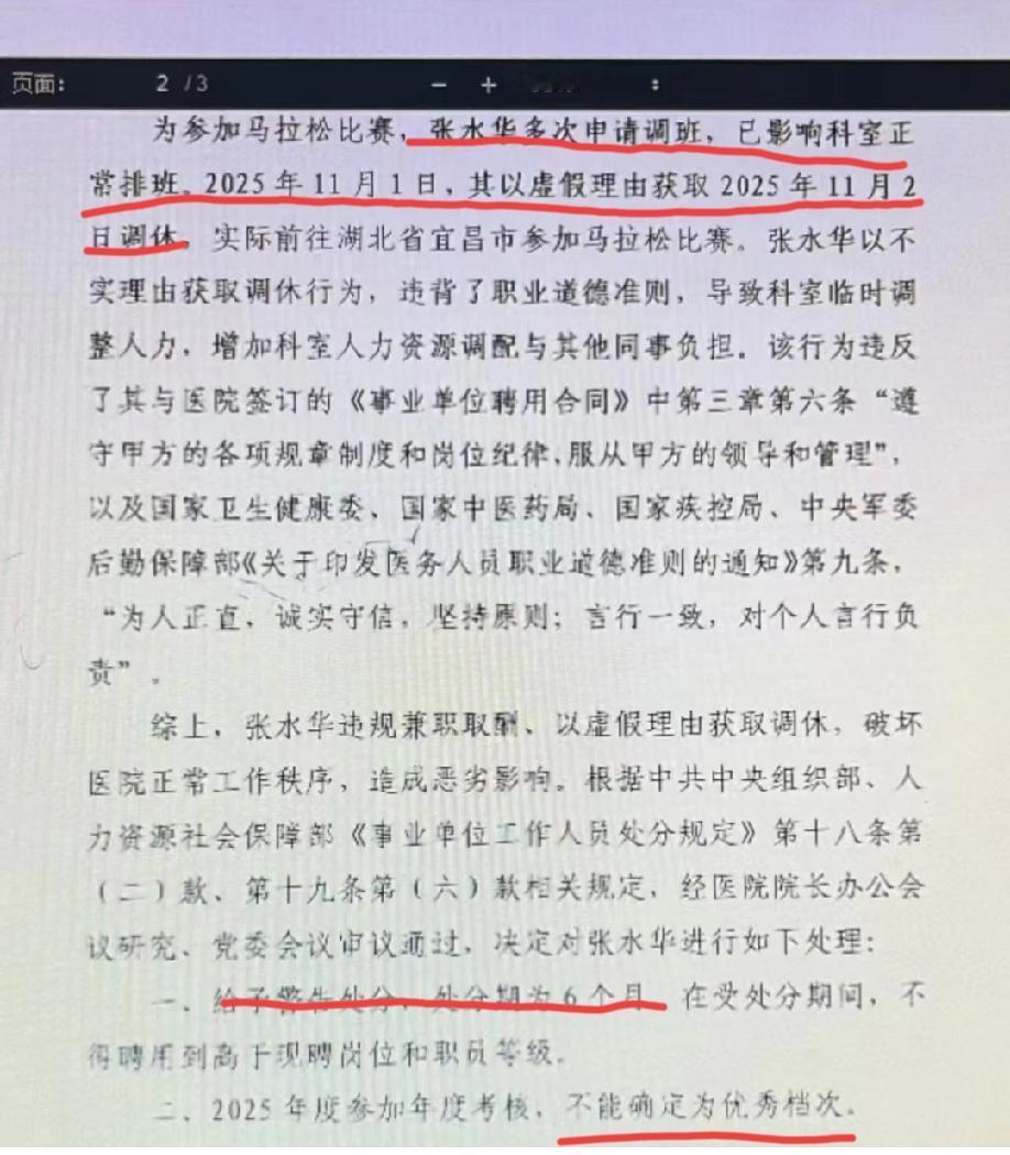 “最快女护士”张水华因多次申请调班,且以虚假理由获取调休,被其所在医院处于六个月