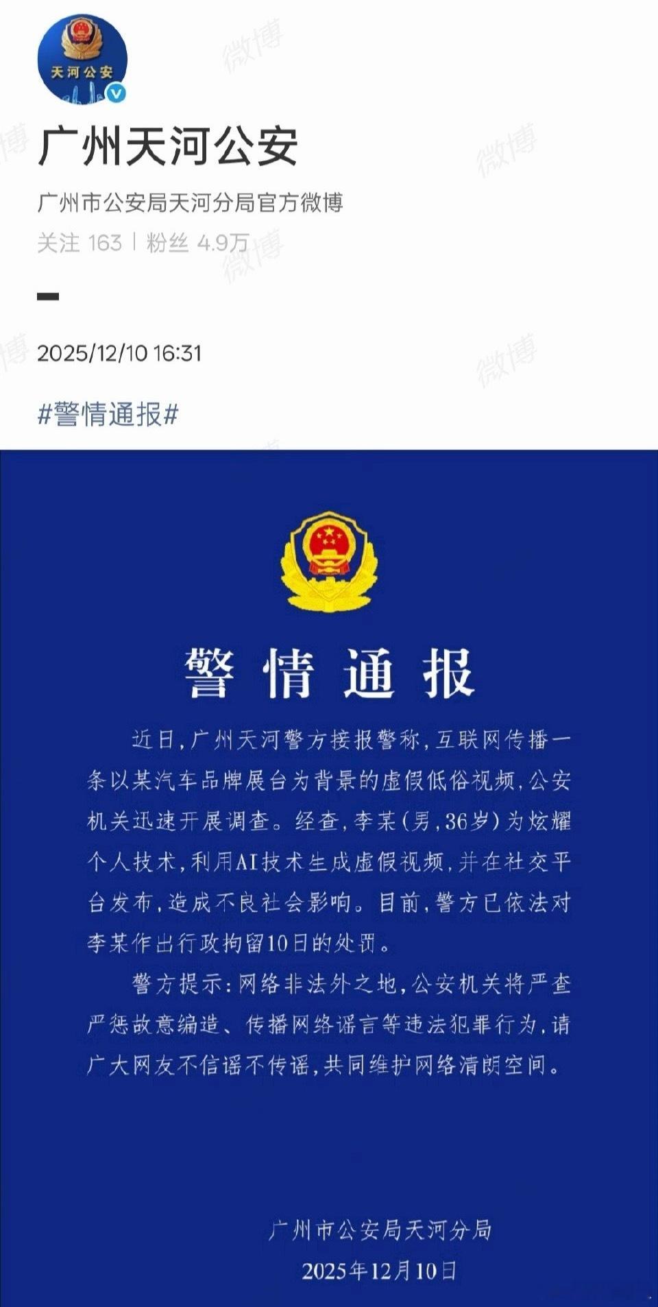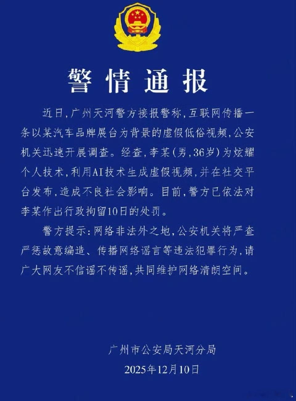 广州警方这效率能成事此前,小鹏汽车就有人利用AI技术生成虚假视频向公安机关报案。案件现已侦破,涉案男子李某为了炫耀个人技术,利用AI生成虚假视频,被公安机关处以治安拘留10日的处罚。当时还有吃瓜群众不信这是AI生成的视频,看来现在的AI造假技术已经可以以假乱真了。广州车展AI视频造假者被警方抓获小鹏展台AI视频造假者已被拘留新能源汽车