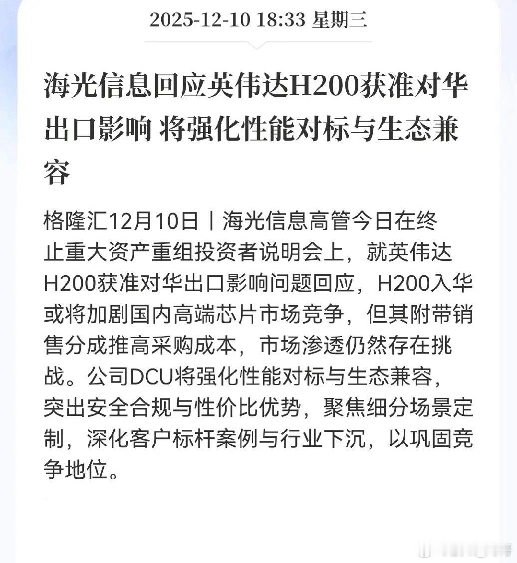 海光这次应对H200入华的思路挺清晰,也显得很务实。他们没被顶级旗舰的名头吓住,而是看到了H200价格高、有分成负担的软肋!这样一来,他们不硬碰参数,主打安全合规和高性价比这两张牌,就特别对国内一些客户的胃口!更聪明的是,他们不贪大求全,强调深耕细分场景、做好定制化。这相当于避开正面火力,在自己熟悉的领域里筑牢优势!通过打造标杆案例,再往更多行业下沉,路子走得很稳。这态度其实传递了信心,高端市场让巨头去卷,我在实际应用里扎根,机会还是很大的!