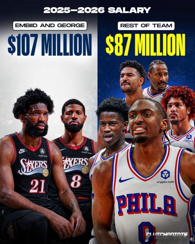 恩比德和乔治的薪水占全队的 55%两人每场比赛的得分只占全队的 27% 乔治目前场均14.1分,是其职业生涯第三低的场均得分。恩比德正打出职业生涯最低的场均18.2分。