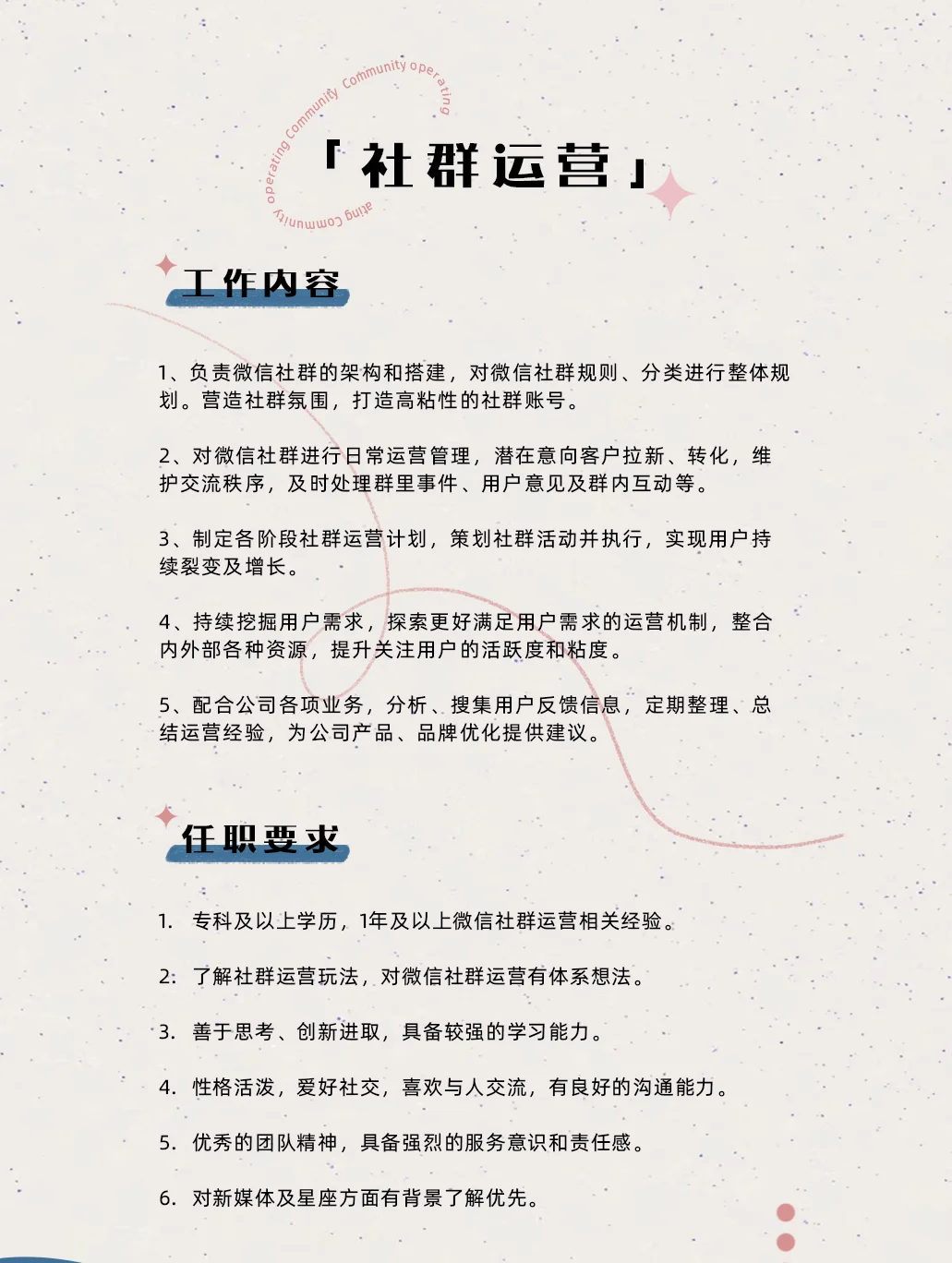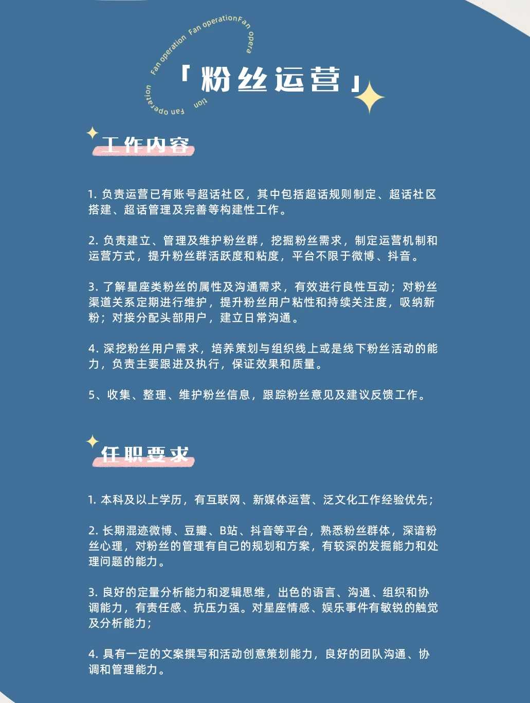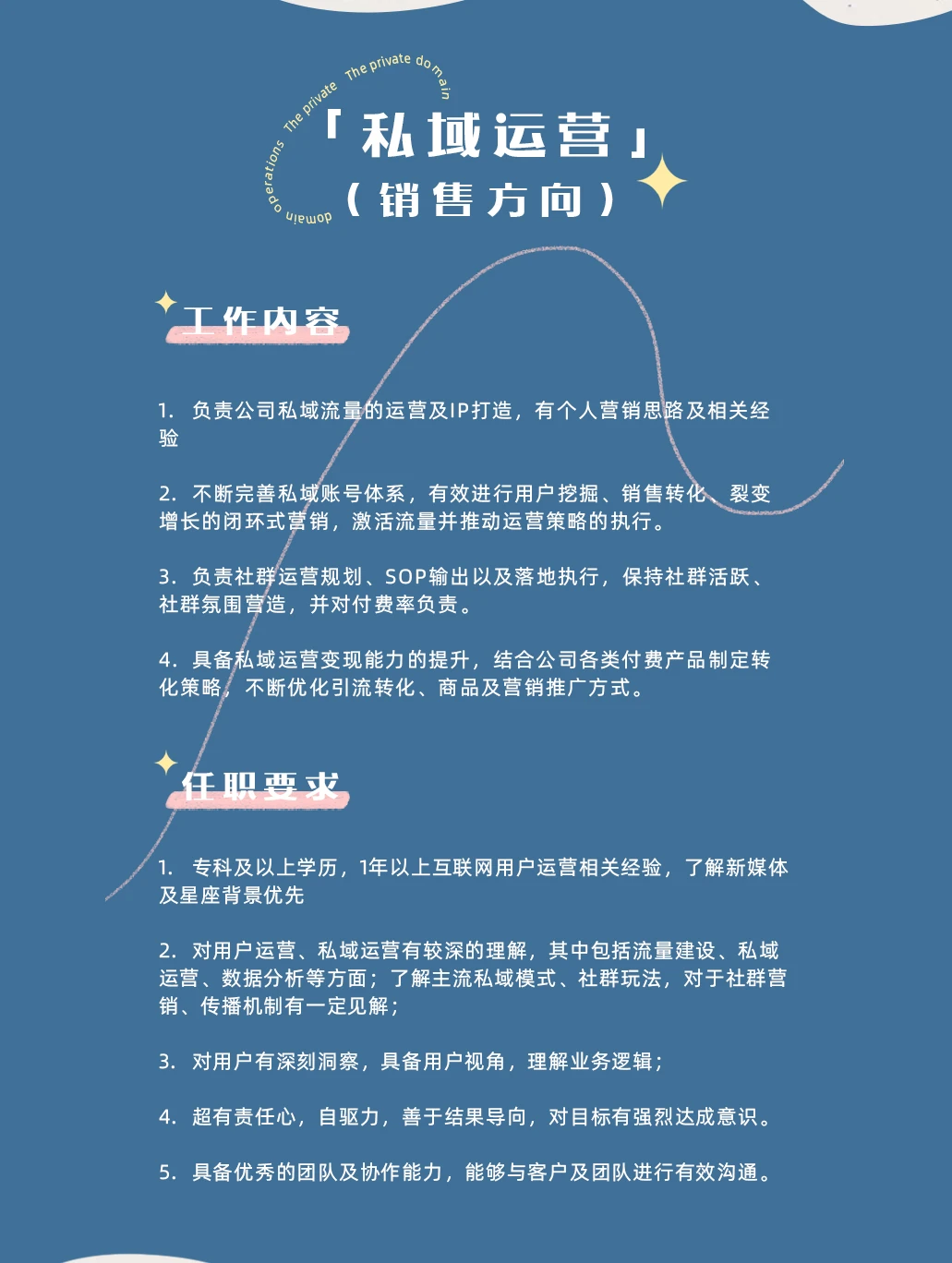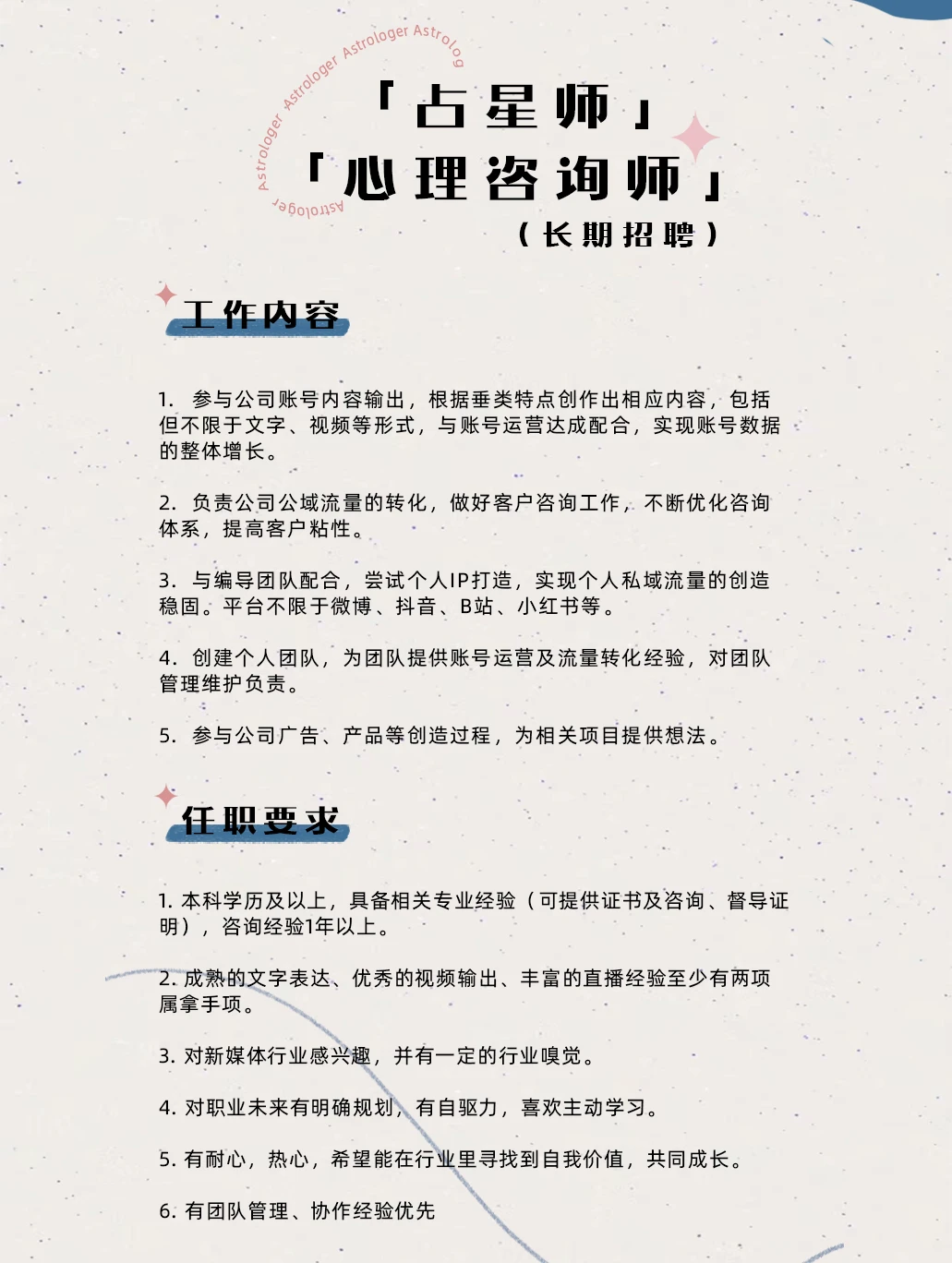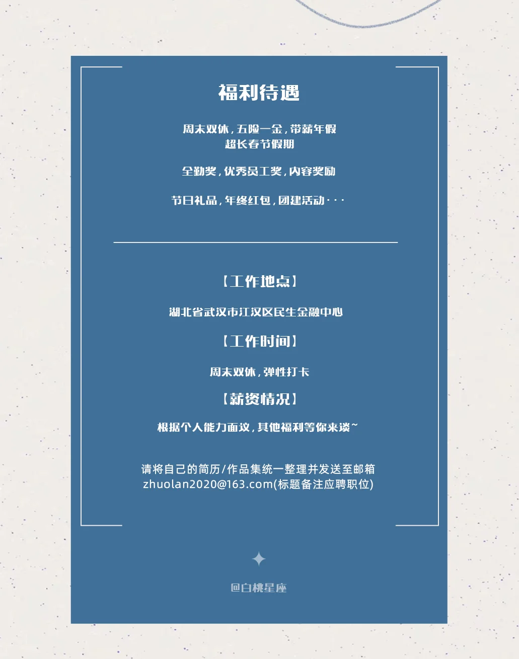 ✨白桃工作室是一群热爱星座、热衷于玩转新媒体的小伙伴们聚集在一起的大家庭。 ✨废话不多说,直接来介绍这次我们想要寻找的小伙伴吧!👇 ❗️❗️❗️本次开放岗位主要有: 粉丝运营、社群运营、私域运营(销售方向)、占星师以及心理咨询师(详情见图)。 ✨如果你也一样对新媒体和星座感兴趣,有足够大的脑洞,那就赶快来加入我们吧![暗中观察R] ✨我们在这里等你的加入哦~[派对R]