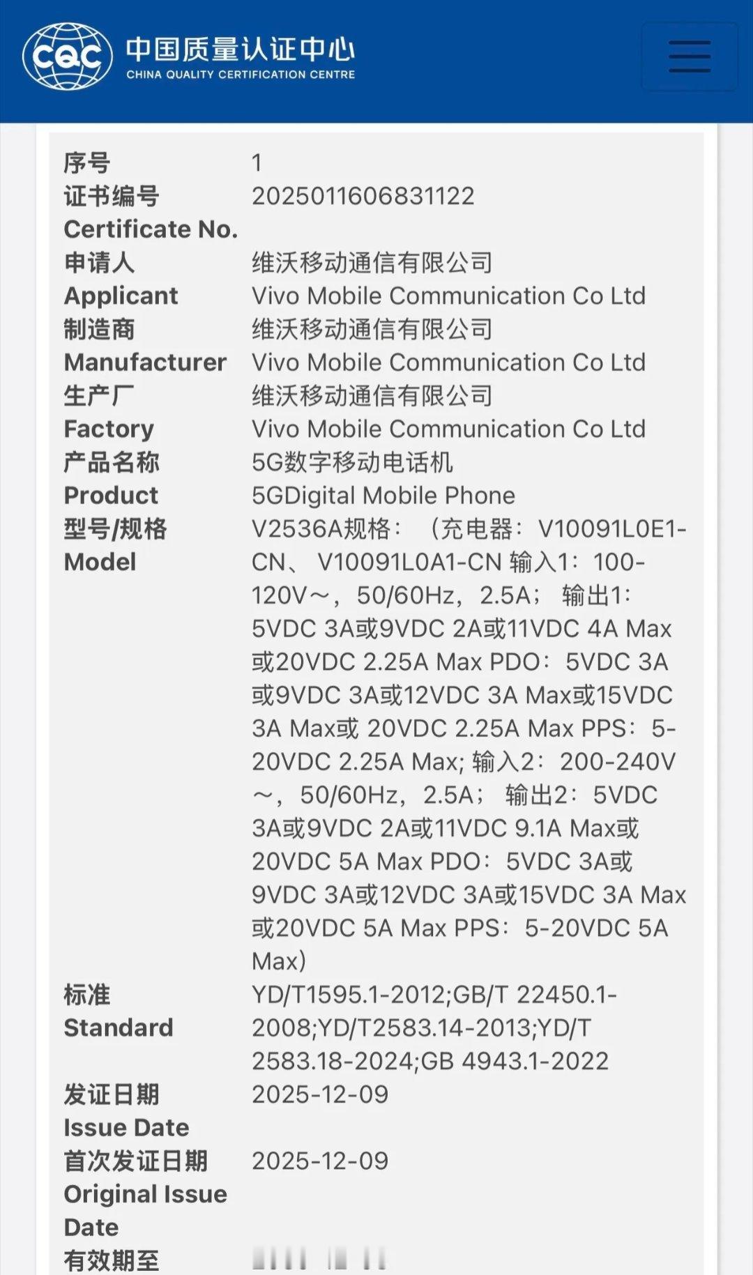iQOO 15 Ultra?vivo 新机 V2536A 通过国家质量认证,支持 100W 快充。