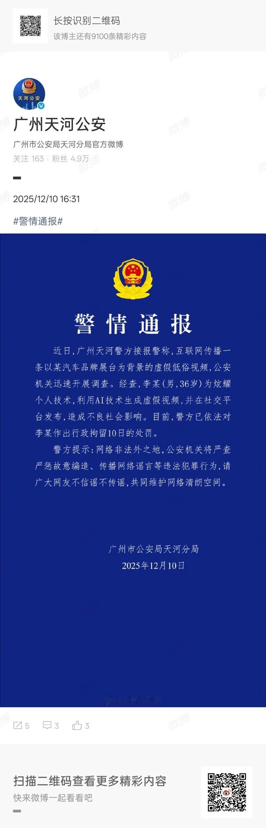 广州车展期间,小鹏汽车就有人利用AI技术生成虚假视频向公安机关报案。12月10日,小鹏汽车法务部官方微博发布声明,该案件现已侦破,涉案男子李某被公安机关处以治安拘留10日的处罚。近年来警方查处的多起造谣案件当中,借助AI技术编造并恶意传播虚假内容,扰乱公共秩序的行为屡见不鲜,这些虚假信息造谣成本低,传播速度快、范围广,给企业机构和个人都造成了极其的恶劣影响。相关部门正在通过权威信息发布、跨部门联动执法等举措依法惩治AI制假行为,让造谣传谣者承担相应的法律责任。小鹏汽车法务部表示,将通过法律途径严肃追责,共同营造风清气正、守法有序的网络环境。广州车展AI视频造假者被警方抓获小鹏展台AI视频造假者已被拘留