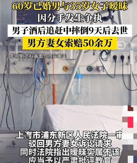 2024年,上海浦东,60岁已婚大爷与35岁女子搞暧昧,与对方一起喝酒后,见对方提出分手,骑共享单车离开后,连忙去追对方,结果摔倒,经抢救无效死亡。事后,虽然医院推定大爷系心源性猝死,但是大爷的家人难以释怀,向女子索赔54万余元。法院这样判!(文中人物均为化名)   事发当天晚上,60 岁的尹大爷揣着半瓶没喝完的白酒,跟着 35 岁的孟女士走到了路边。没人知道这两人私下里的往来持续了多久,只清楚尹大爷早有家室,儿女都已经成家,平日里看着是个话不多的普通退休老人,唯独对着孟女士时,总愿意掏点钱、搭点时间 —— 哪怕这关系从一开始就摆不上台面。   那天孟女士像是铁了心,没接尹大爷递过来的烟,直接说 “以后别联系了”。尹大爷酒劲上来,拉着人不肯放,争执了几句,孟女士一扭身扫了辆共享单车就往路口骑。   尹大爷急了,把酒瓶往路边一扔,趔趔趄趄地追上去,没跑两步脚下一滑,“咚” 地摔在人行道的台阶边,半天没爬起来。   孟女士骑出去几十米听见动静,回头看了眼倒在地上的尹大爷,犹豫了几秒还是没停,径直走了。等路人发现尹大爷的时候,他脸色发白,喊他也没多少反应,赶紧打了 120 送进医院。   这一躺,尹大爷就没再醒过来。医院的诊疗记录写着 “心脏呼吸衰竭”,家属后来拿到的结论是 “心源性猝死”—— 说白了,是本身的基础病加上喝酒、情绪激动,再加上摔倒的刺激,把这口气给顶没了。   从摔倒到去世,中间隔了 9 天,尹家的妻儿在医院守了整整一周,到最后只等来一张死亡证明。   出事后,尹家的情绪一下绷不住了。他们之前隐约知道尹大爷外头有人,但从没料到会以这种方式收尾。看着空荡荡的家,再想起这些年尹大爷偷偷给孟女士花的钱,家属越想越窝火,转头就把孟女士告上了浦东法院,索赔 54 万余元,理由是 “她要是不跑,尹大爷就不会追,也不会出事”。   这事儿传到网上,评论区直接炸了锅。   有人说 “一把年纪了不守本分,自己喝了酒追人,这能赖谁?”   也有人替家属委屈 “好好的人没了,换谁都难受。”   还有网友补了句 “孟女士哪怕打个 120 再走,也不至于落这么多话柄。”   等了几个月,法院的判决下来了:驳回尹家的全部诉讼请求。法官没绕弯子,直接说尹大爷是酒后自行追赶导致摔倒,本身的心脏问题是死亡主因,孟女士的离开和他的猝死没有法律上的因果关系。   同时也明明白白地指出,尹大爷作为已婚人士和他人保持暧昧,这事儿 “实属不该,应当予以严肃批评教育”。   这事儿从头到尾捋下来,其实就是裹着糊涂关系的一场意外。但也算是给不少人提了个醒:甭管多大年纪,感情上拎不清,迟早要出乱子;真遇上事儿,别光顾着置气,先顾着人命比啥都重要。   你说这事儿里,到底是谁的步子错得更离谱?评论区聊聊你的看法呗。