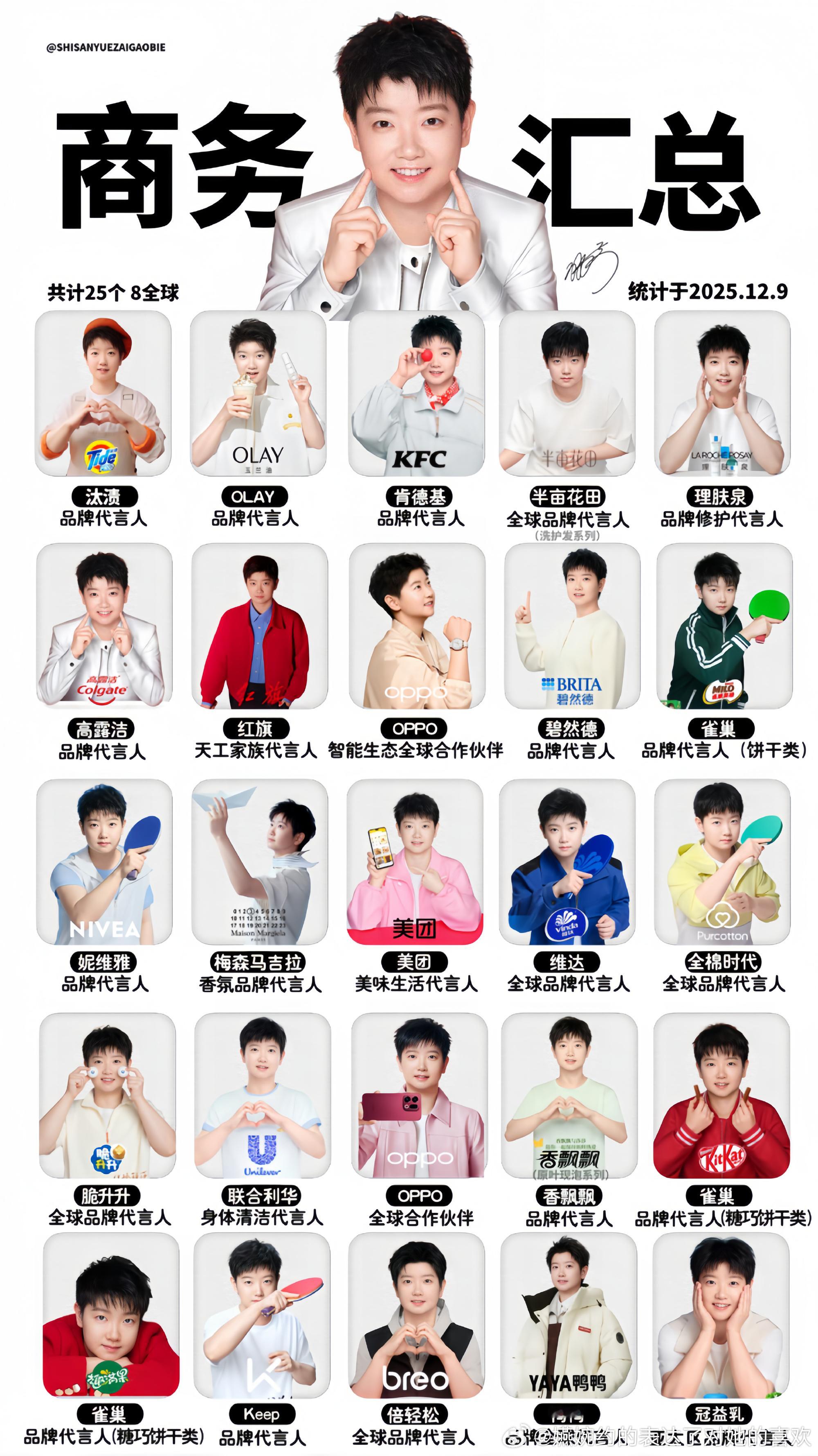 谁看了孙颖莎的代言汇总图都会震撼并且留下羡慕的口水的,如何做到几乎都是顶流代言过或者正在代言,并且官宣后销量惊人的