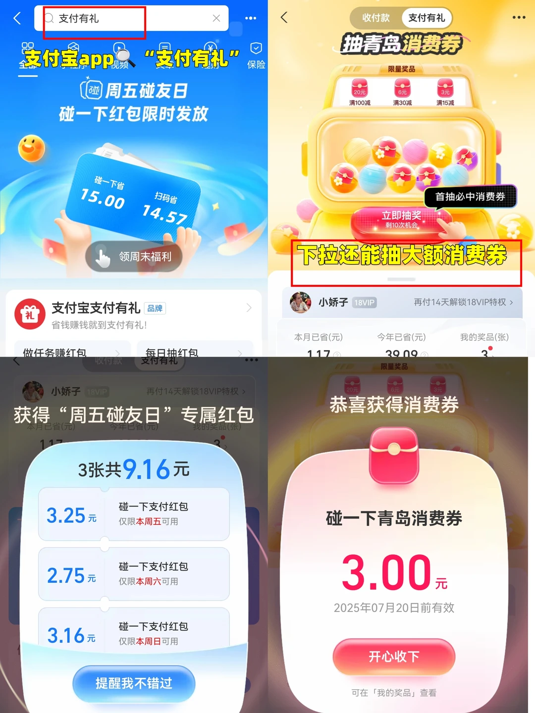 ✅7.18-7.20号17:00,上支付宝搜索“支付有礼”领红包,还可以抽大额青岛消费券,碰一下支付时自动抵扣,方便又省💰❗