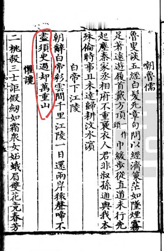 分享我今日的见闻从小读“朝辞白帝彩云间,千里江陵一日还。两岸猿声啼不住,轻舟已过万重山。”这首诗都是这样的!没想到如图这两个古版书上,这首诗竟然是这样的。大家说这是怎么回事呢?!