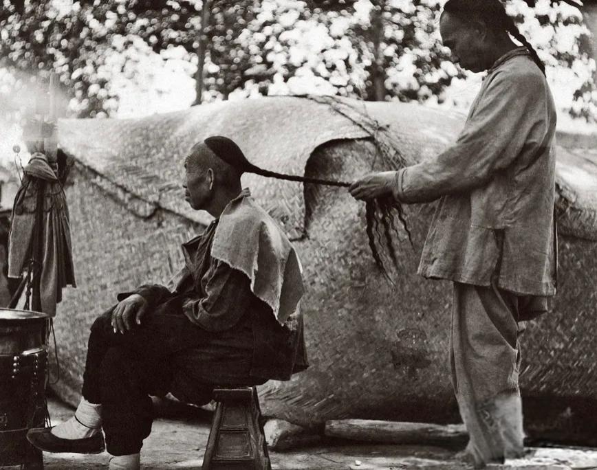 晚清街头的一位剃头匠,正在为顾客梳理辫子。