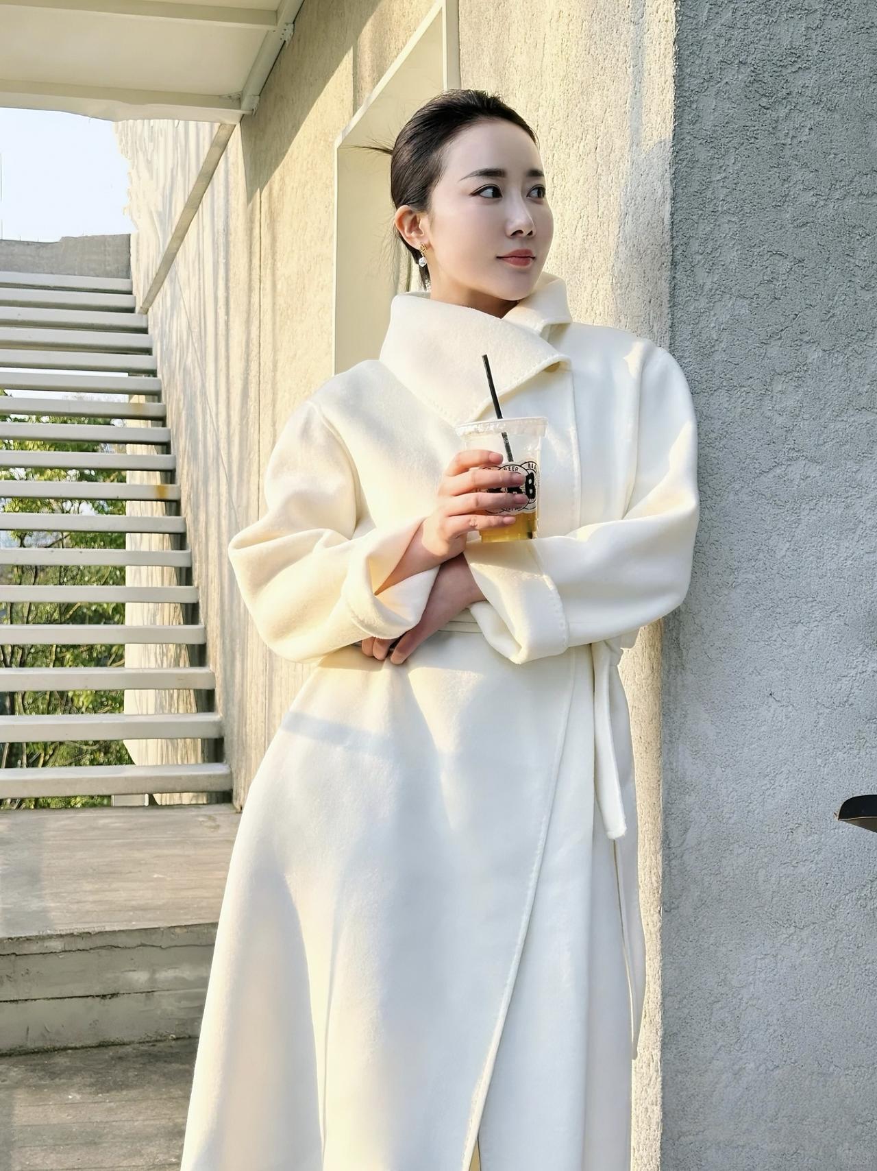 抓住秋天的尾巴,和阳光撞了个满怀✨ 奶白色大衣裹满温柔,腰带一收把松弛感和利落都