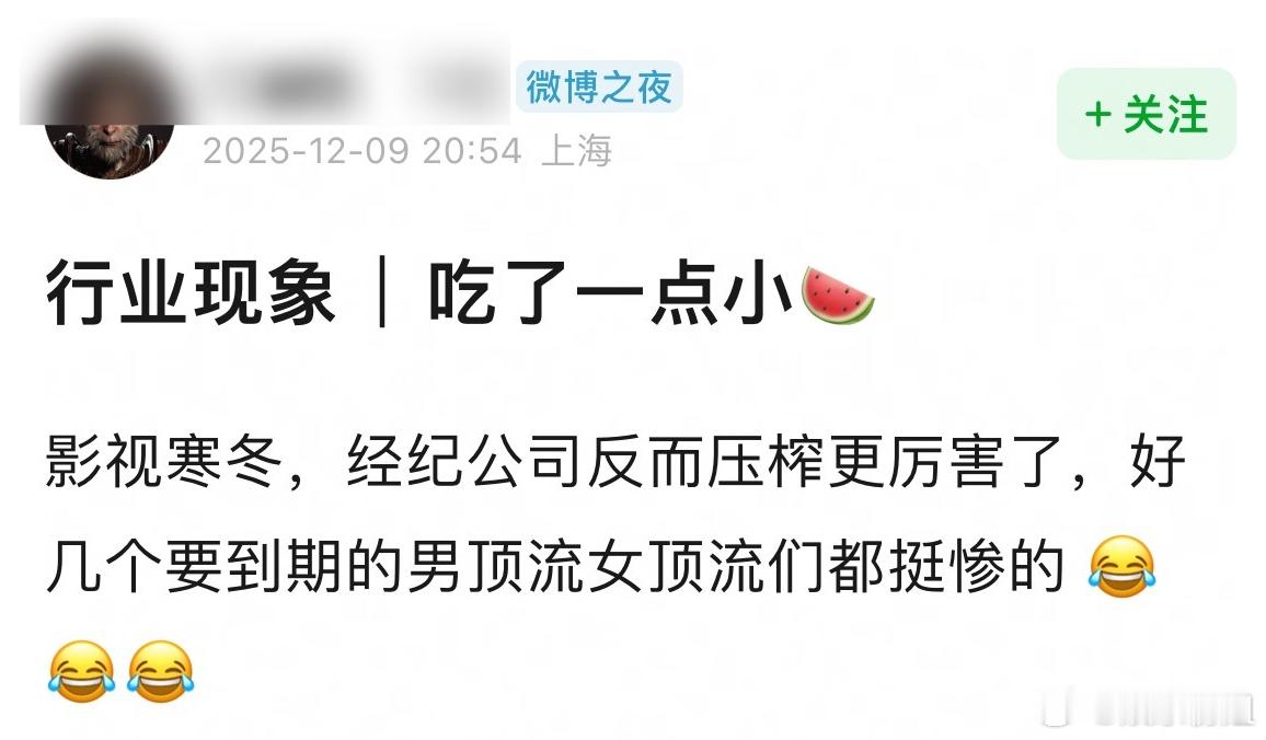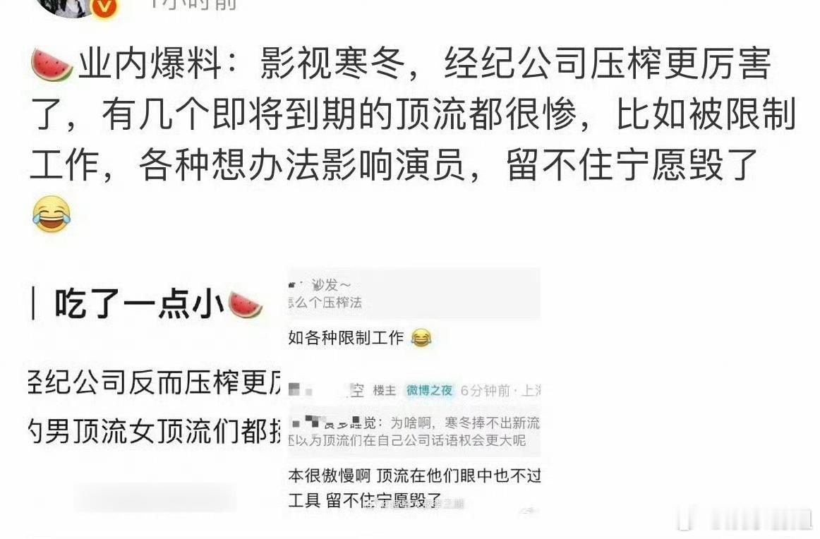 曝经纪公司压榨即将到期的顶流🍉业内曝:影视寒冬,几个即将到期的顶流被经纪公司压榨,比如各种限制工作。