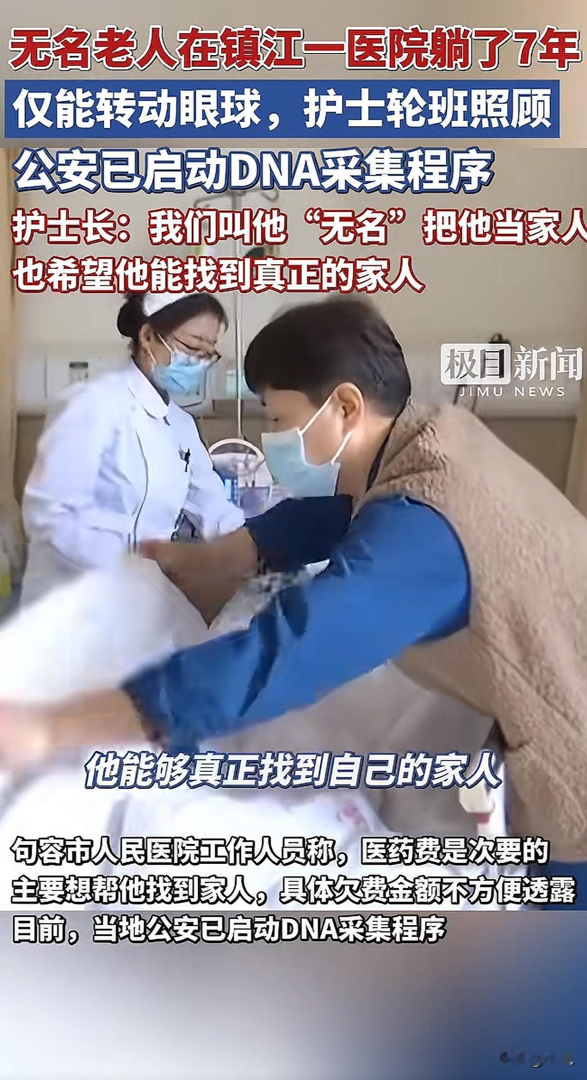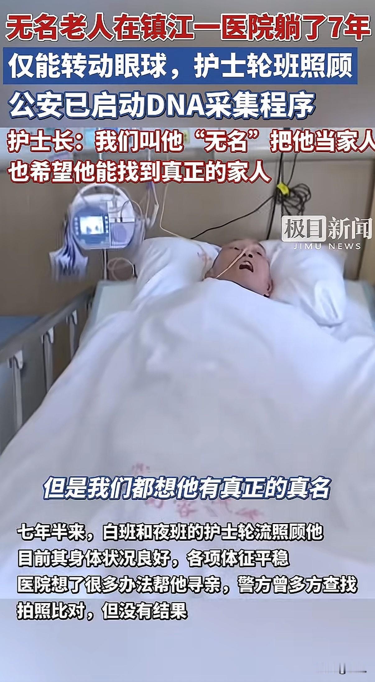 医院一张病床上,躺着一个没名字的男人,整整七年半。没人知道他叫啥,也从没人来交过一分钱。 这事发生在江苏句容市人民医院。 2018年5月27号晚上,他晕倒在路边。警察发现的,给送到医院。人是救活了,但因为严重低血糖,脑子受了不可逆的损伤。 他完全不能动了。不会说话,四肢没法活动,连吞咽都不行。只有眼珠能微微转动。维持生命,全靠一根从鼻子插到胃里的管子,每天往里打营养液。 从那一天起,他就留在了神经内科的病房里。成了科室里最特殊的“常住客”。 医院不是没想办法。第一时间就报警寻亲。警察用人脸识别技术比对过,没找到能对上的。联系过民政部门,也找过救助站。得到的回复基本是,这种情况不符合接收条件,他们也没办法。 于是,所有担子都落在了医院身上。 一天二十四小时,一年三百六十五天。护士每两个小时要来给他翻一次身,拍拍背,防止长褥疮。一天就是十二次,七年多算下来,接近两万次翻身。每天要给他做口腔护理,全身擦洗。 护士们已经习惯了。她们一边轻柔地给他擦脸,一边会自然地说:“擦干净舒服多了,是吧?” 这么精心的护理下,他躺了七年半,皮肤完好,没生过一次褥疮,也没得过严重的吸入性肺炎。 这些工作,都有成本。人力、床位、药品、营养液、各种耗材。七年半,是一笔巨大的开销。这些钱,一直欠着。 医院公开说过,这占用了紧张的医疗资源,很多急需住院的病人还在排队。但他们依然在做着这一切。 最近,事情好像有了一点进展。句容警方重启程序,采集了他的DNA,试图在全国数据库里寻找他的身份线索。 这就是全部事实。一个人倒下,被救治,然后陷入一个漫长的停滞状态。 为什么能躺七年半?表面看,是医院基于救死扶伤的天职在接手,是医护人员不忍放弃的生命。往深里看,也暴露出现实中的一个模糊地带:对于这种找不到家属、完全失能、无支付能力的特殊患者,谁来负责?怎么负责?有没有一个清晰的流程和出口? 医院似乎陷入了一个两难:继续承担,成本压力巨大;停止或转移,又面临伦理和法律的拷问。 这件事没有简单的对错。它更像一面镜子,照出了生命的重量,也照出了系统在面对极端个案时的困顿。他依然静静地躺着,而我们的思考,或许才刚刚开始。