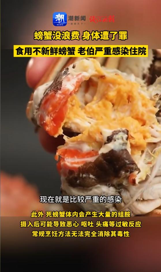 “悲剧还是发生了!”近日,上海,一老人为避免浪费,将家中存放三天的大闸蟹煮熟吃光,没想到吃完不久后就开始上吐下泻,发起了高烧,家人见状连忙将他送往医院诊治,发现是因为食物中毒引起的严重感染。网友:该扔就得扔! 最近,社交平台上一则来自“高彩萍和乔老爷”的分享,让不少网友纷纷转发提醒身边人。 这个账号的主人是乔任梁的父母,他们分享的内容里提到,乔爸爸因为心疼家里存放了三天的大闸蟹,不愿看着食材白白浪费,便一次性吃了10只,其中8只早就死了。 没过多久,乔爸爸的身体就开始不舒服,食物中毒引发的发烧让他不得不前往医院就诊。 初期退烧后病情曾有缓和,可没过多久又出现反复,只能继续留院观察调理。 这桩看似平常的小事,却藏着关乎食品安全的大问题,也让大家重新思考节俭与健康的关系。 作为常见的水生甲壳类食材,大闸蟹的生存环境决定了它本身就携带不少细菌和真菌。 这些微生物在螃蟹存活期间,会被其自身的生理机制约束,不会轻易对人体造成危害。 可一旦螃蟹死亡,体内的各项机能瞬间停止,原本被抑制的微生物就如同失去管控的“捣乱分子”,开始疯狂滋生繁殖。 更危险的是,这个过程中还会产生组胺等有毒物质,这些毒素有着极强的耐热性,日常蒸煮的温度根本无法将其彻底清除。 对于消化功能本就相对薄弱的老年人来说,食用这类含毒死蟹后,出现恶心、腹痛、腹泻等不适的概率会大幅增加,严重时还会引发高烧,乔爸爸的情况就是典型例子。 而且螃蟹死亡的时间越长,毒素积累就越多,对身体的伤害也会随之加剧,绝非煮熟就能消除隐患。 节俭,一直是深植于国人心中的传统美德,尤其对老一辈人而言,这份观念更是格外深刻。 他们大多亲身经历过物资短缺的岁月,深知每一份食物都凝聚着辛劳,所以面对还能勉强食用的食材,总会下意识地选择留存而非丢弃。 乔爸爸会坚持吃掉存放三天的死蟹,核心也是不想让花出去的钱和精心购买的食材付诸东流,这份珍惜物资的心情,相信很多人都能感同身受。 但值得注意的是,节俭从来都不该与科学健康相悖,更不能成为忽视安全的借口。 不少长辈心里都有个固有认知,觉得只要把食物彻底煮熟,就不用担心变质的问题。 可实际上,像死蟹这类食材,其变质过程中产生的毒素早已超出高温能化解的范围,即便煮 得再久再透,毒素依然会残留体内,食用后只会给肠胃和身体带来额外负担。 真正的节俭,从来不是盲目留存变质食材,而是在保证健康的前提下合理利用资源。 一旦发现螃蟹已经死亡,哪怕外观看起来毫无异常,也千万别抱着侥幸心理烹饪食用,果断丢弃才是最稳妥的选择。 乔任梁父亲的这段经历,虽没有造成严重的健康风险,却给所有家庭敲响了警钟。 我们尊重长辈们珍惜物资的习惯,也认同节俭是值得传承的美德,但传承不等于墨守成规,更不能以牺牲健康为代价。 如今大家获取食品安全知识的渠道越来越多,不妨多花点时间和家里的长辈分享这些实用信息。 不用刻意否定他们的习惯,而是用真实案例和科学常识告诉他们,吃掉变质的死蟹并不是真正的节俭,反而可能引发健康问题,到时候既需要花钱治疗,还要承受身体上的痛苦,得不偿失。 不浪费食物是对劳动的尊重,而守护好自己的身体健康,不让家人为自己担忧,更是对生活最基本的负责。 乔爸爸的经历也让更多人明白,死蟹无论看起来多新鲜、多可惜,都不能冒险食用,节俭的前提是讲科学,健康永远比节省一点食材更重要。