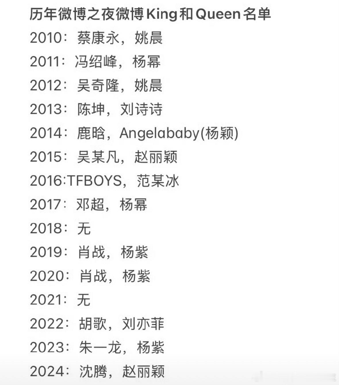 历年的King和Queen预测一下今年的King和Queen,感觉极有可能是刘宇宁or肖战 和杨幂🦊:今年带三部作品强势归来,《生万物》《酱园弄》《长安的荔枝》实绩直接让🥝单开了一个年度演员奖项;而且今年的星光依旧璀璨,VOGUE、ELLE、芭莎盛典、维密大秀,各种定毯神针顶刘:今年解锁了三平台破万男主,播出的《折腰》《书卷一梦》成绩都不错,常驻综艺《地球超新鲜》《开始推理吧》,作为歌手巡演门票半秒售罄,剧综音三栖发展也十分罕见👍:《藏海传》热度破👖平台历史记录,云合年榜第一,出海190+国家与地区;电影作品《得闲谨制》上映5天票房破2亿,成为年末现象级黑马;商业价值与影视作品并进,也是🧣King的有力竞争者