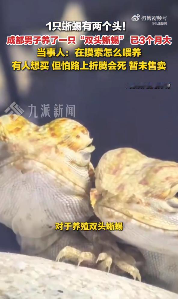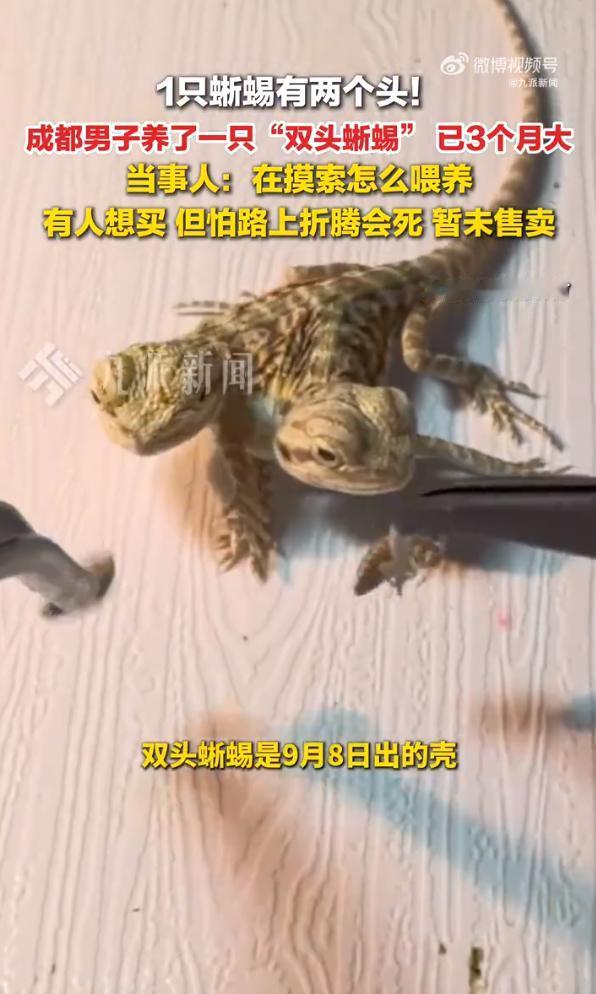 四川成都一位网友分享自己养的“双头鬃狮蜥”,拥有两个上半身,现在已经有3个月大,有人想买,但怕路上折腾会死,暂未售卖。 最近,四川成都一位网友分享的宠物视频火了,视频里的主角不是常见的猫狗,而是一只罕见的双头鬃狮蜥。 这只蜥蜴正舒展着趴在平面上,皮肤带着鬃狮蜥标志性的棘刺状鳞片纹理,姿态看着特别放松,还处于幼体阶段。 它最特别的地方就是长着两个完全独立的头部,两个上半身还各配了一对前肢,六条腿自然撑开,稳稳地支撑着整个身体,走起来的样子很特别。 它的身体还覆盖着浅黄褐色和深色交织的清晰斑纹,细长的尾巴上还有一圈圈的环状纹路,整体模样既新奇又让人忍不住想多看两眼。 视频一经分享,很快就引发了网友们的广泛关注,大家纷纷在评论区表达自己的惊奇,毕竟双头动物平时实在太难见到了。 很多网友都好奇,这只蜥蜴有两个脑袋,它们的思想会是一样的吗。 还有人担心,万一一个脑袋想吃东西,另一个不想吃,会不会影响它正常进食,这些新奇的疑问让这只蜥蜴更受关注了。 网友们还不约而同地表达了希望它能健康长大的心愿,每天都有人蹲守在博主主页,想看看这只特殊小家伙的最新动态。 这只双头鬃狮蜥的主人是邢先生,他在接受采访时说,这只蜥蜴是 2025 年 9 月 8 日出生的,到现在刚好 3 个月大。 邢先生养蜥蜴已经快 4 年了,算是个有经验的养殖户,但面对这只双头鬃狮蜥,他还是不敢掉以轻心。 这只蜥蜴的体质比普通鬃狮蜥弱很多,邢先生每天要给它喂养两到三次,前两个月更是完全靠手喂,才能保证它摄入足够的营养。 邢先生透露,其实他之前还养过另一只双头鬃狮蜥,可惜那只蜥蜴最终没能存活下来,不幸夭折了。 正因为有过这样的经历,他对这只新的双头鬃狮蜥格外关注,照顾起来也更加细心谨慎,就怕再出什么意外。 从生物学角度来看,双头动物的出现其实是一种连体畸形现象,属于胚胎发育异常的结果。 这种情况在爬行动物中偶尔会发生,概率非常低,主要和遗传、环境等多种因素有关。 不过这类动物的生存难度通常比普通个体大很多,体质普遍更弱,对生存环境和饲养条件的要求也更高,这也是为什么双头动物如此罕见的原因之一。 虽然相关的科学解释存在,但网友们对这只蜥蜴的好奇并没有减少,反而因为知道了它的特殊性,更希望它能顺利长大。 自从视频走红后,已经有不少人联系邢先生,表示想购买这只双头鬃狮蜥,愿意出不低的价格。 但邢先生并没有答应,他考虑到这只蜥蜴体质本来就弱,运输过程中的折腾很可能会让它生病,甚至死亡。 而且邢先生对这只蜥蜴也有了感情,加上之前的遗憾,他更想亲自照顾它,看着它一点点长大,而不是为了盈利冒风险。 目前,邢先生还在慢慢摸索针对双头鬃狮蜥的特殊养殖方式,很多细节还需要不断尝试和调整。 他每天都会仔细观察蜥蜴的状态,记录它的进食量和活动情况,一旦发现异常就会及时调整饲养方式。 现在,这只双头鬃狮蜥还在邢先生的细心照料下健康成长,每天过着吃了睡、睡了玩的小日子。 它的每一个小举动都会被记录下来分享给网友,两个小脑袋偶尔会微微晃动,仿佛在回应网友们的关注。