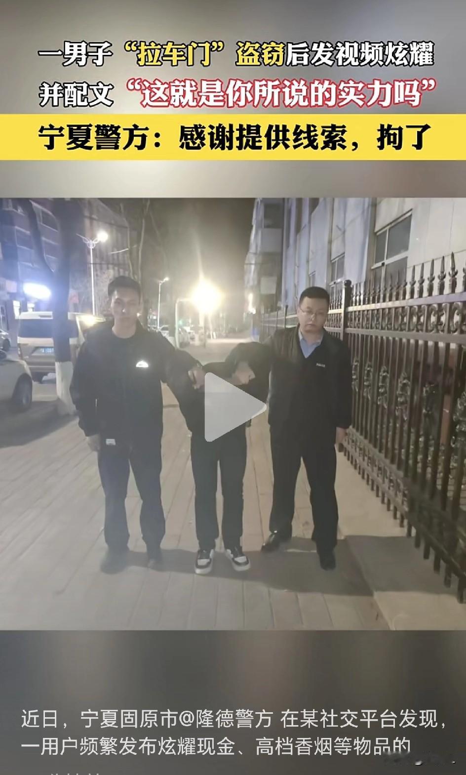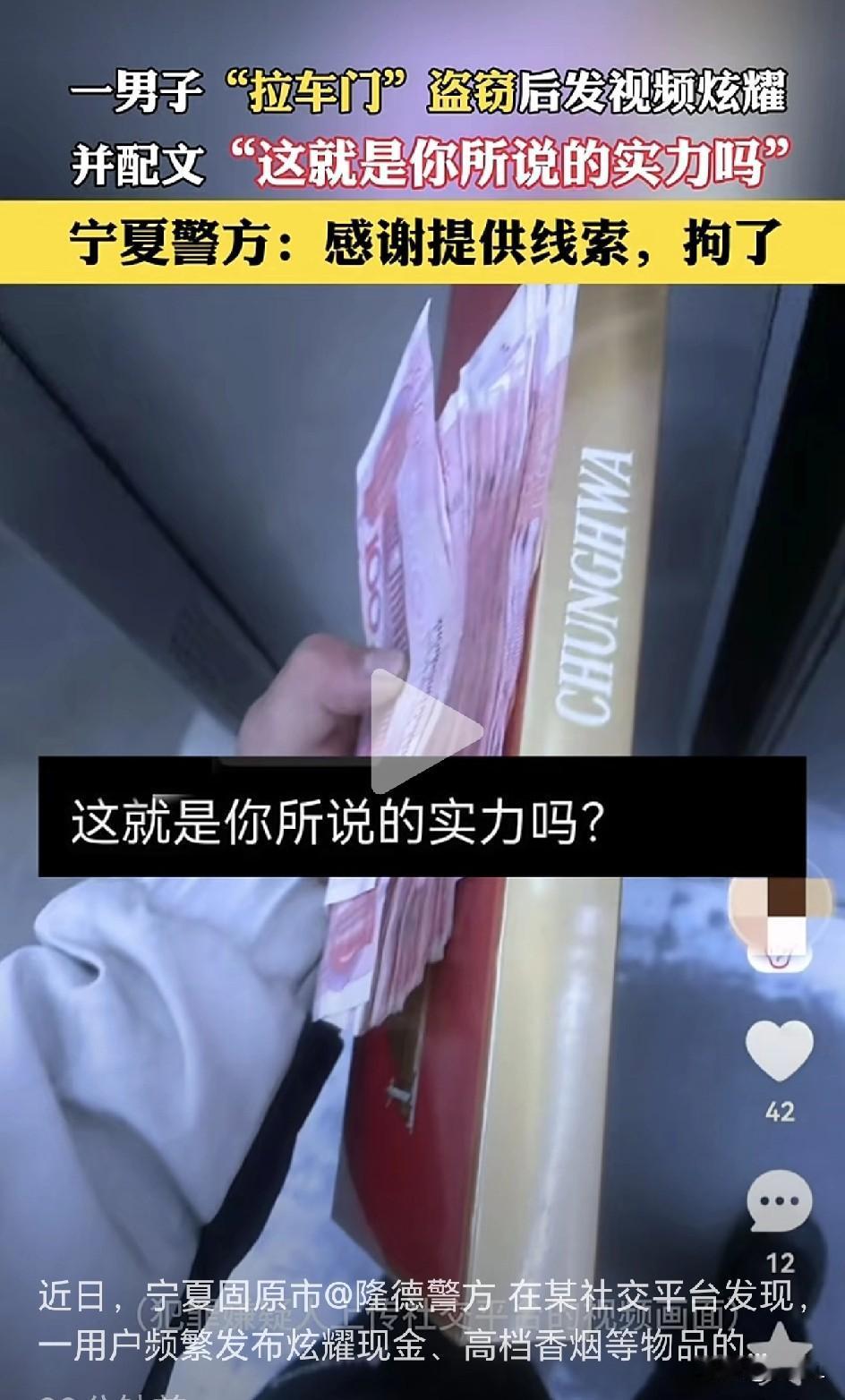 “MVP结算画面”?这贼太嚣张!偷完东西还敢发视频炫耀,结果…… 见过嘚瑟的,没见过这么嘚瑟的! 最近,宁夏隆德县的民警在网络巡查时,发现了一个奇葩账号。 这哥们儿可不是普通网红,他专发“炫富视频”:一沓沓现金、一堆堆高档香烟,摆得那叫一个气派。 最绝的是配文:“MVP结算画面”——好家伙,这是把偷东西当游戏通关了?还给自己评个“最有价值玩家”? 民警眉头一皱,发现事情并不简单:“这钱来得这么轻松?怕是有点问题。”顺着网线一查,发现事情巧得离谱: 这位“大佬”发视频嘚瑟的时间,正好是县城多起盗窃案发生的时间;他定位出现的地方,常常第二天就有人报案。 视频里闪亮登场的现金、香烟牌子,和受害人报失的物品特征对上了——简直是“线上销赃直播”。 视频主角黄某,近期没干啥正经工作,专挑月黑风高夜,在隆德县城和周边乡镇“加班”。 他的工作流程非常简单:挨个拉车门,碰上没锁的,直接“自助提现”;偶尔还“业务拓展”,溜门撬锁进居民家。前前后后偷了一万多块钱的东西。 不仅仅偷,他还把“战利品”拍成短视频,配上嚣张字幕,生怕别人不知道他“业绩突出”。 这波操作,堪称“自投罗网”的典范。 警方锁定目标,迅速出手。面对找上门的警察,黄某倒也“光棍”,对多次盗窃的行为供认不讳。 网友神评论预判: “真·‘盗’此一游,游进班房。” “这是年度最佳‘破案线索提供者’吧?” “建议改名:《如何通过社交媒体成功举报自己》。” “警方:感谢老铁送的火箭(线索)!” “这波操作叫:自带证据,上门服务。” “从‘MVP’到‘看守所VIP’,只需一次炫耀。” 温馨提示: 1. 下车锁门!锁门!锁门! 重要的事情说三遍,别给“拉车门”选手留机会。 2. 家中门窗要关好,特别是晚上和外出时。 3. 财不外露,也尽量别在车里放贵重物品。 4. 发现可疑情况,立即报警! 正告那些心术不正的人:莫伸手,伸手必被捉。想当“人生MVP”?路可千万别走歪了! 目前,这位“MVP选手”已退出游戏,等待他的将是法律的“终极结算”。人生这场游戏,走正道才能稳赢啊! 信息来源于宁夏新闻网,侵联删!