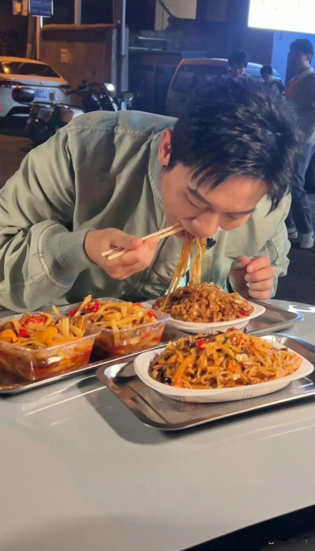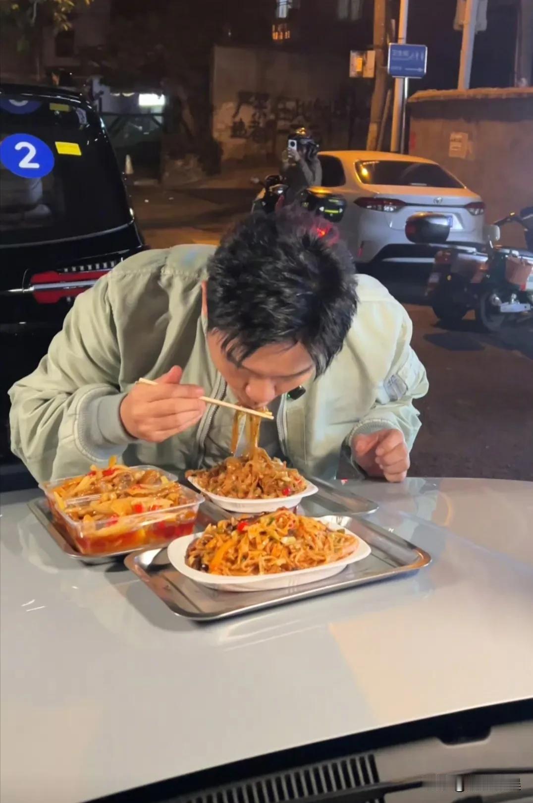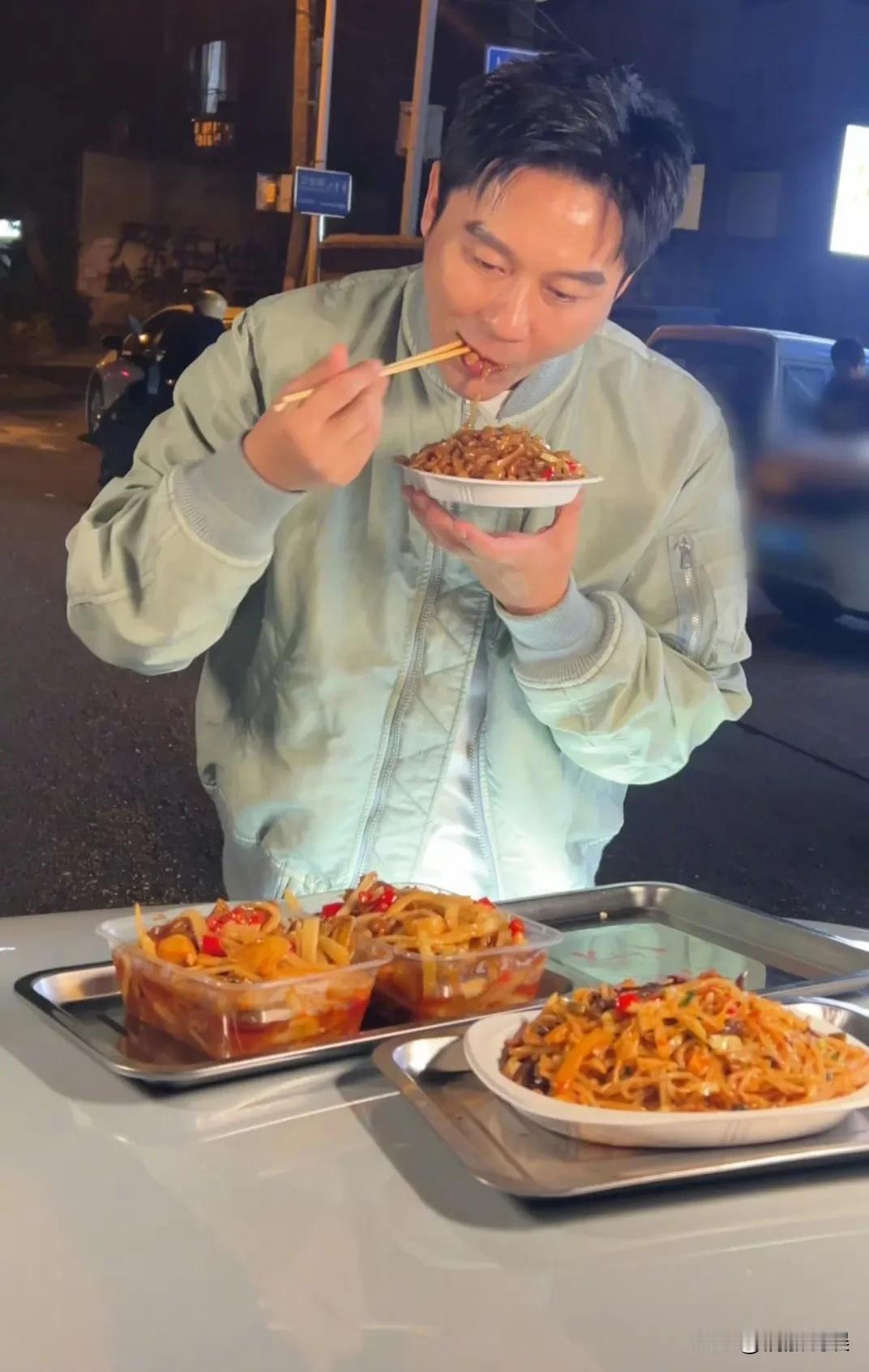 李晨这人还真是没什么明星包袱啊! 他在柳州录节目,抵不过螺蛳粉的诱惑,深夜还自己开车出来到路边摊吃螺蛳粉。 他穿着一件浅绿色外套,快奔五的人了,身材还是保持得挺好的,高高瘦瘦,唯独脸上有少少的沧桑感。 他拿到螺蛳粉后,站在路边,立刻快乐的嗦起粉来,大口大口的吃着,看起来吃得特别香,毫无明星形象,特别接地气。 只是这不是餐台吧,怎么看着有点车子的前车盖?