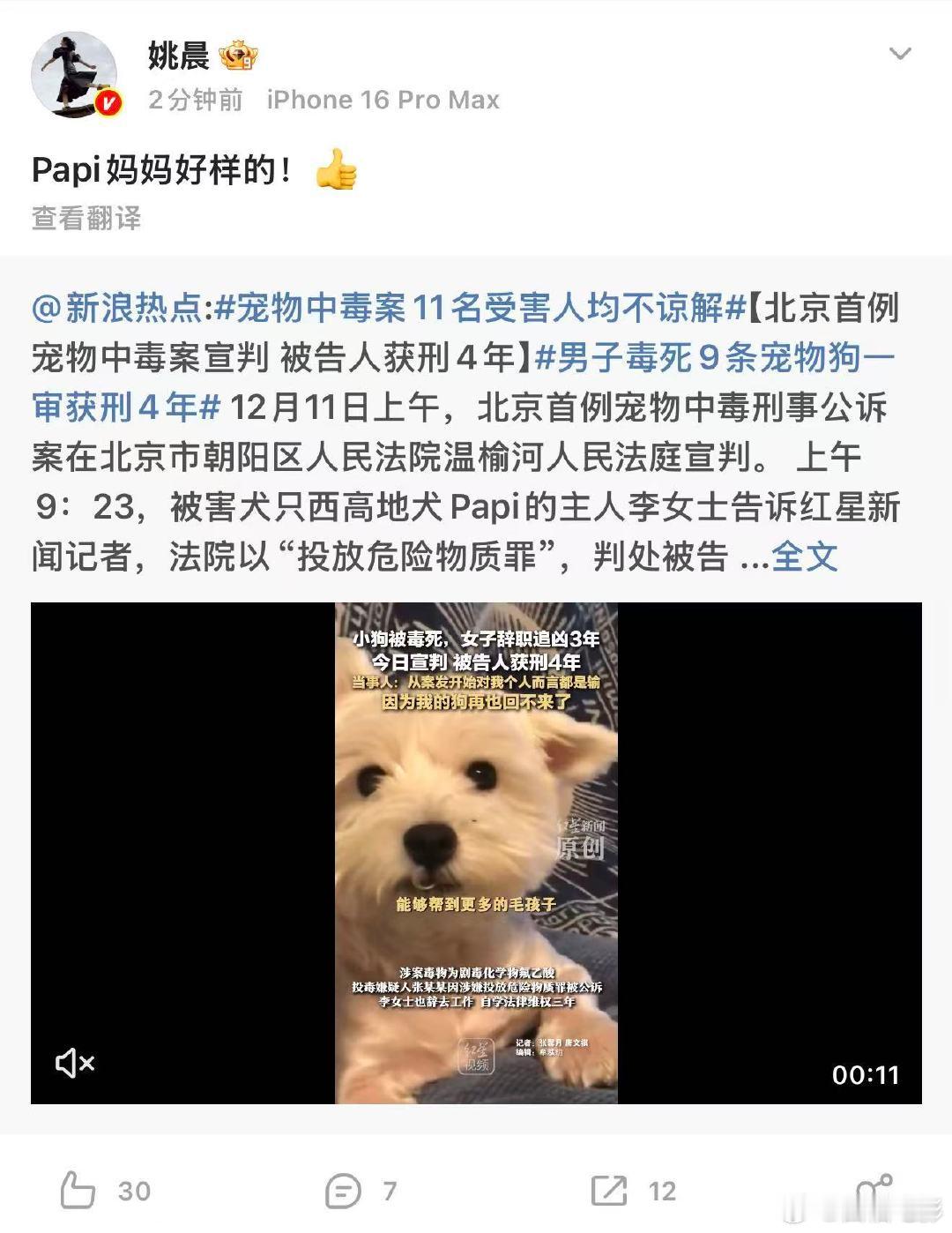 姚晨支持papi妈妈姚晨点赞支持papi妈妈12月11日,北京首例宠物中毒案宣判,被告人获刑4年。发文点赞支持papi妈妈:“Papi妈妈好样的!👍”papi妈妈