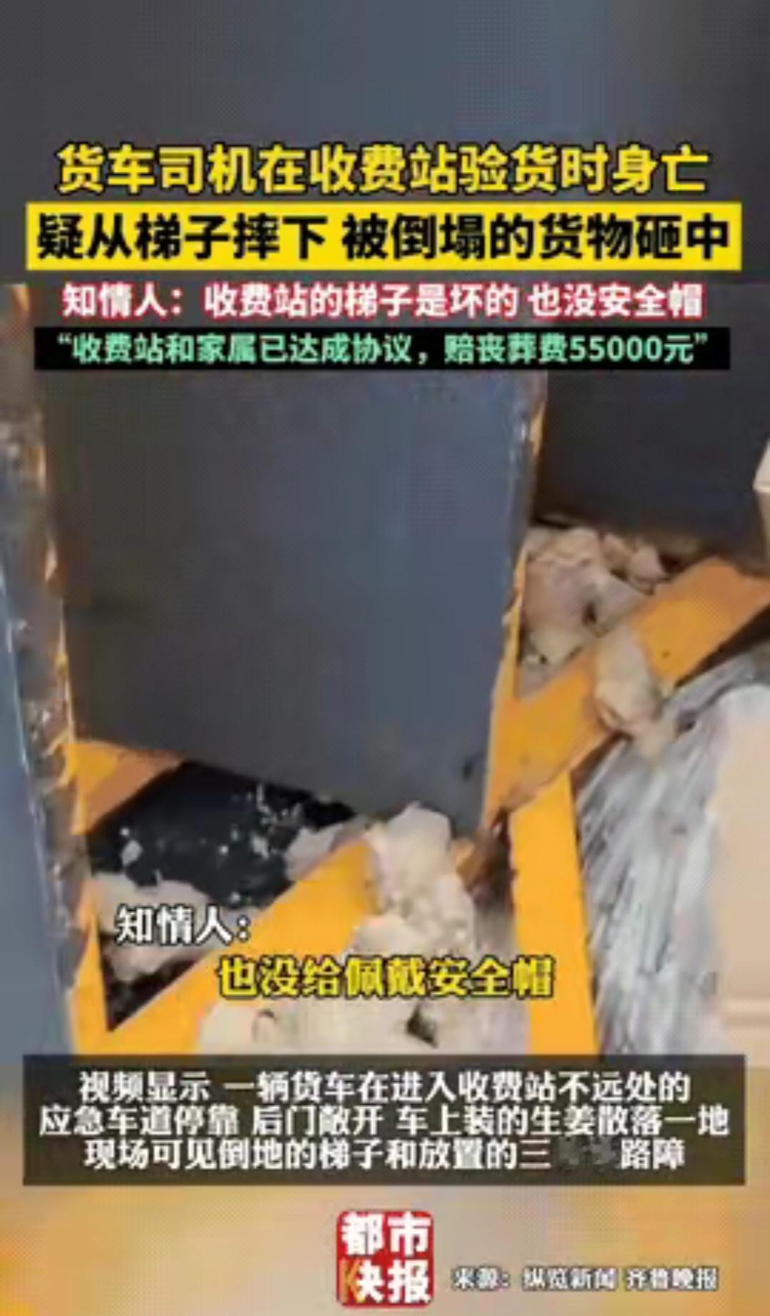 "严查到底!"近日,河南商丘,一货车司机过收费站时,工作人员要检查车上的货物,要求司机爬梯子上去拍照验货,结果收费站的梯子是坏的,再加上司机没有佩戴安全帽,没人扶梯,最终摔落离世。 事情发生在12月6号下午,河南商丘双八收费站。司机是山东聊城阳谷人,拉了一车生姜从广西运往潍坊,走绿通通道时被要求爬梯子验货。 梯子两米多高,轮子固定扣是坏的,根本站不稳。收费站的人自己戴着安全帽,却没给司机准备一顶,也没人扶梯子。搬到第四箱时,梯子一滑,人摔下来被货物砸中。 国家规定超过两米就算高空作业,得有安全帽、安全绳这些防护。事后收费站赔了五万五千元丧葬费,家属说还要走法律程序。这点钱真不够干啥的。 其实2022年交通部就发了通知,要求用X光扫描这些高科技设备检查绿通货物,不用人爬高。有些省份早用上了,这地方还在用老办法。 很多司机都遇到过这种事,绿通检查动不动就要上车顶揭篷布,不揭就不让过。有的收费站折腾半小时,司机得爬上爬下好几趟。 这就是不把司机当人看,图自己省事。有技术不用,有规定不执行。赔点钱就想了事?没那么便宜。得有人负责,得改制度,不然还得死人。